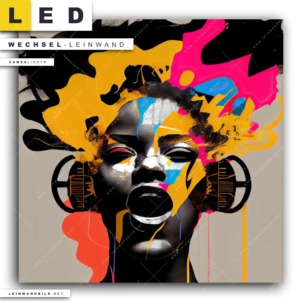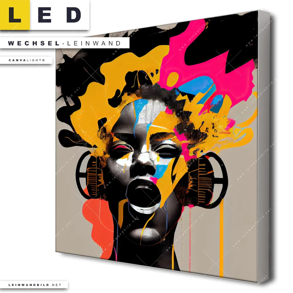Du bist auf der Suche nach einer Porträts - Menschen Wechsel-Leinwand für Dein LED-Leinwandbild im Quadratischen Format? Begriffe wie Frau, Portrait, Gesicht, Mädchen, Dame, Farbe, Musik, Kopfhörer haben Dich auf der Suche nach Deiner Ersatz-Leinwand für dein LED Wandbild mit wechselbarer Leinwand inspiriert? Farben wie Beige, Schwarz, Orange, Pink dürfen auf Deinem neuen Wechselmotiv für Dein XXL Leinwand-LED-Bild nicht fehlen und Leinwände im Abstrakt, Modern Art Stil für Leuchtbilder passen perfekt zu Deinem Einrichtungsstil?