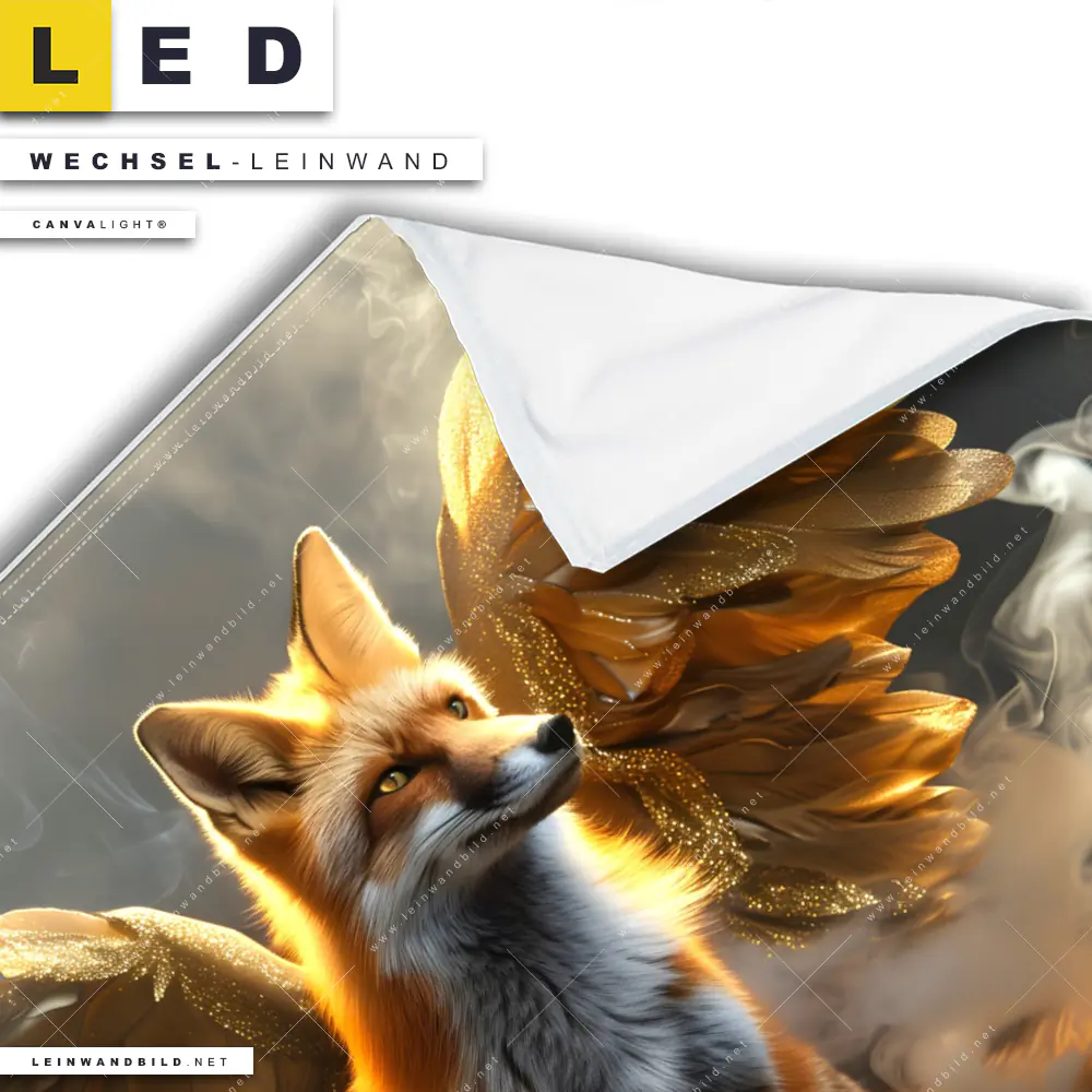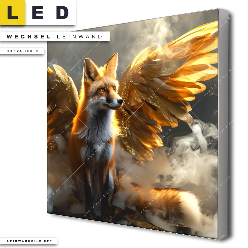 Du konfigurierst Deine individuelle LED Wechsel-Leinwand Canvalight® TEX | Fuchs mit goldenen Flügeln | Quadrat und wir produzieren sie NEU für Dich. Unsere Tierwelt Austausch-Fotoleinwände für Canvalight® LED Bilder sind KEINE Lagerware. Du bist Dir unsicher, welches Motiv oder Format das richtige für dein individuelles LED Wechselmotiv auf Leinwand ist, dann helfen wir dir gerne weiter und beraten dich!