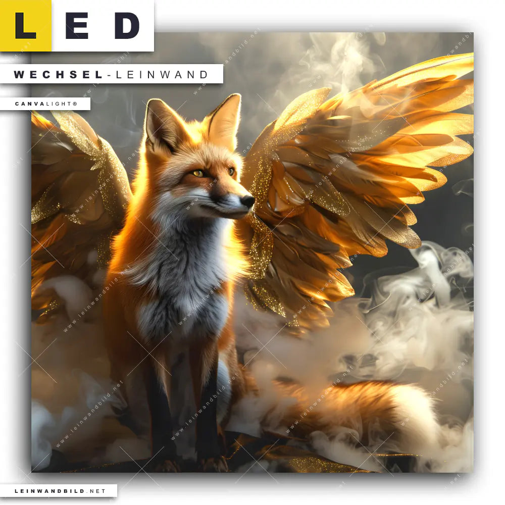 Du bist auf der Suche nach einer Tierwelt Wechsel-Leinwand für Dein LED-Leinwandbild im Quadratischen Format? Begriffe wie Fuchs, Rotfuchs, Tier, Tierporträt, Rauch, Nebel, Wolken, Flügel, Fantasy haben Dich auf der Suche nach Deiner Ersatz-Leinwand für dein LED Wandbild mit wechselbarer Leinwand inspiriert? Farben wie Orange, Gold, Braun dürfen auf Deinem neuen Wechselmotiv für Dein XXL Leinwand-LED-Bild nicht fehlen und Leinwände im Modern Art, Surreal - Fantasy Stil für Leuchtbilder passen perfekt zu Deinem Einrichtungsstil?