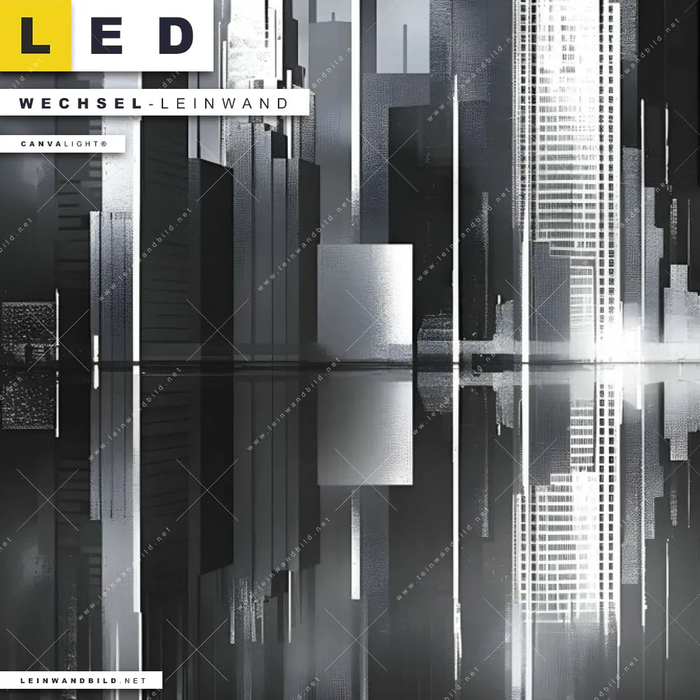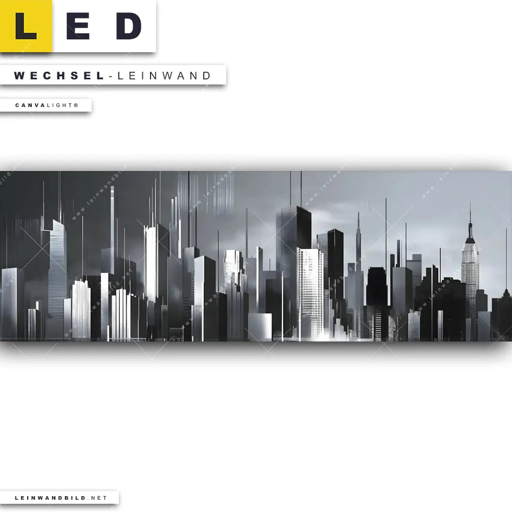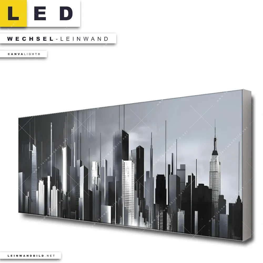 Du bist auf der Suche nach einer Städte - Skylines Wechsel-Leinwand für Dein LED-Leinwandbild im Panorama-Format? Begriffe wie Skyline, Metropole, Häuser, Wolkenkratzer, Hochhäuser, Stadt, Gebäude, Kunst, Malerei haben Dich auf der Suche nach Deiner Ersatz-Leinwand für dein extra breites LED Wandbild mit wechselbarer Leinwand inspiriert? Farben wie Schwarz, Weiss, Silber dürfen auf Deinem neuen Wechselmotiv für Dein XXL Leinwand-LED-Bild nicht fehlen und Leinwände im Modern Art, Abstrakt, Schwarz - Weiss Stil für Leuchtbilder passen perfekt zu Deinem Einrichtungsstil?