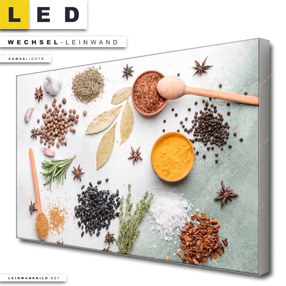 Du konfigurierst Deine individuelle LED Wechsel-Leinwand Canvalight® TEX | Gewürze auf hellem Untergrund | Querformat und wir produzieren sie NEU für Dich. Unsere Essen - Trinken Austausch-Fotoleinwände für Canvalight® LED Bilder sind KEINE Lagerware. Du bist Dir unsicher, welches Motiv oder Format das richtige für dein individuelles LED Wechselmotiv auf Leinwand ist, dann helfen wir dir gerne weiter und beraten dich!