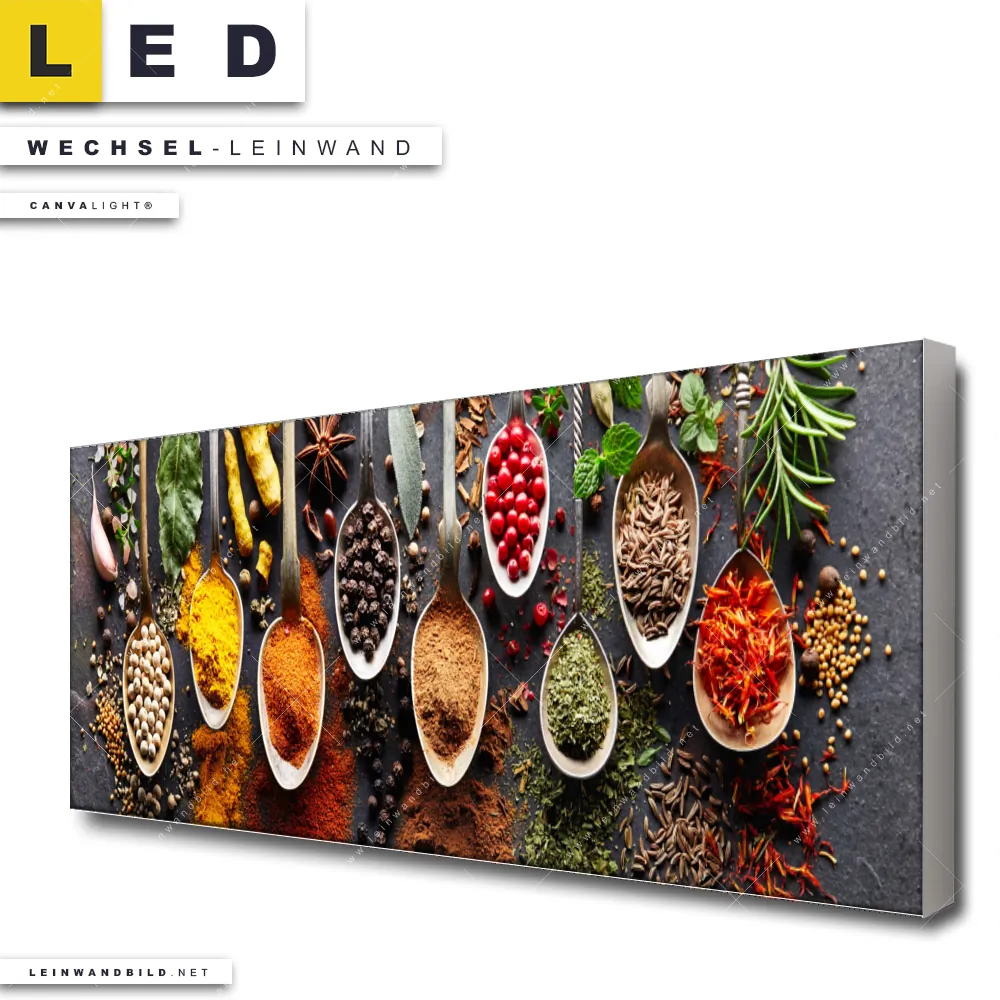 Du bist auf der Suche nach einer Essen - Trinken Wechsel-Leinwand für Dein LED-Leinwandbild im Panorama-Format? Begriffe wie Gewürze, Kräuter, Löffel, kochen, Pfeffer, Curry haben Dich auf der Suche nach Deiner Ersatz-Leinwand für dein extra breites LED Wandbild mit wechselbarer Leinwand inspiriert? Farben wie Bunt, Schwarz dürfen auf Deinem neuen Wechselmotiv für Dein XXL Leinwand-LED-Bild nicht fehlen und Leinwände im Modern Art, Natürlich - Realistisch Stil für Leuchtbilder passen perfekt zu Deinem Einrichtungsstil?