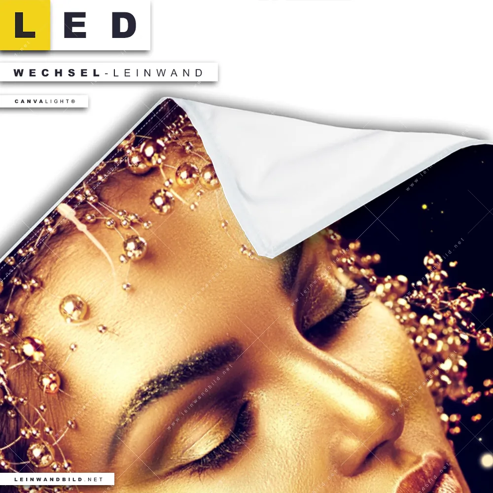 Dann sollte die Wechsel-Leinwand Canvalight® TEX | Golden Girl | Hochformat den Weg zu Dir finden. Die Austausch-Leinwand verzierte Frau mit Goldschimmer - passend für unsere stufenlos dimmbaren, steckerfertigen Leinwandbilder im Leuchtrahmen mit Fernbedienung und optionaler Farbtemperatursteuerung - fügt sich als Eye-Catcher harmonisch in jedes Bar - Gastronomie, Friseur - Beauty, Wohnzimmer - Schlafzimmer Raumkonzept ein.