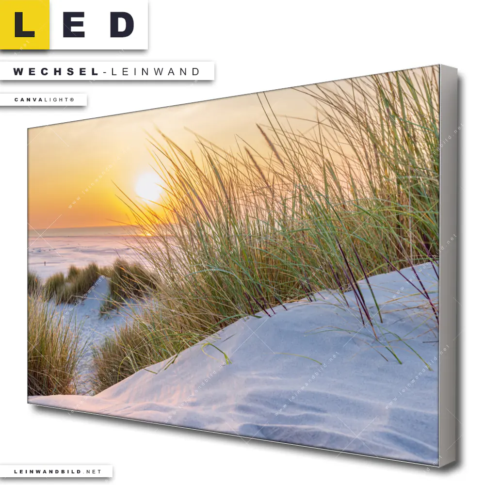 Du bist auf der Suche nach einer Landschaften, Strand - Meer Wechsel-Leinwand für Dein LED-Leinwandbild im Querformat? Begriffe wie Deutschland, Frühling, Sommer, Dünen, Gräser, Nordsee, Ostsee, Sonnenuntergang, Urlaub, Meer, Strand haben Dich auf der Suche nach Deiner Ersatz-Leinwand für dein breites LED Wandbild mit wechselbarer Leinwand inspiriert? Farben wie Beige, Grün, Orange dürfen auf Deinem neuen Wechselmotiv für Dein XXL Leinwand-LED-Bild nicht fehlen und Leinwände im Retro - Vintage Stil für Leuchtbilder passen perfekt zu Deinem Einrichtungsstil?