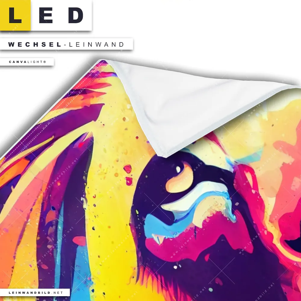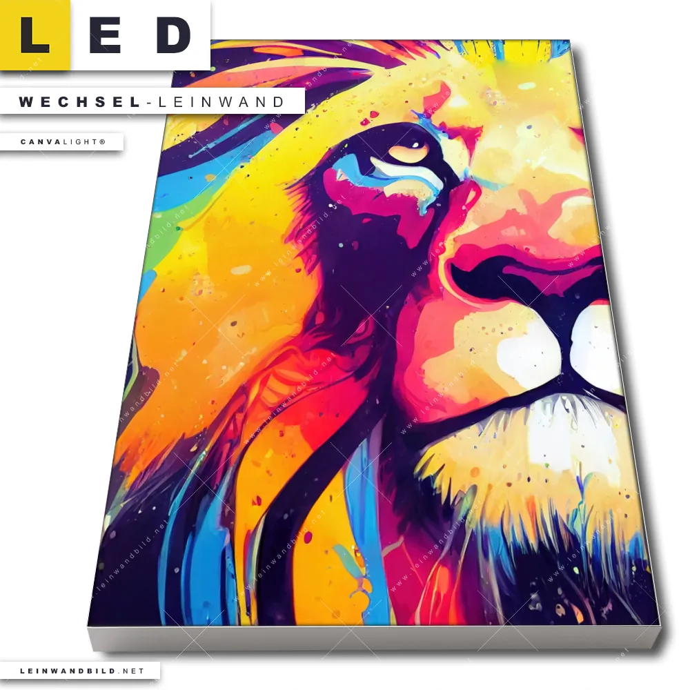 Du konfigurierst Deine individuelle LED Wechsel-Leinwand Canvalight® TEX | Graffiti Löwe | Hochformat und wir produzieren sie NEU für Dich. Unsere Tierwelt Austausch-Fotoleinwände für Canvalight® LED Bilder sind KEINE Lagerware. Du bist Dir unsicher, welches Motiv oder Format das richtige für dein individuelles LED Wechselmotiv auf Leinwand ist, dann helfen wir dir gerne weiter und beraten dich!