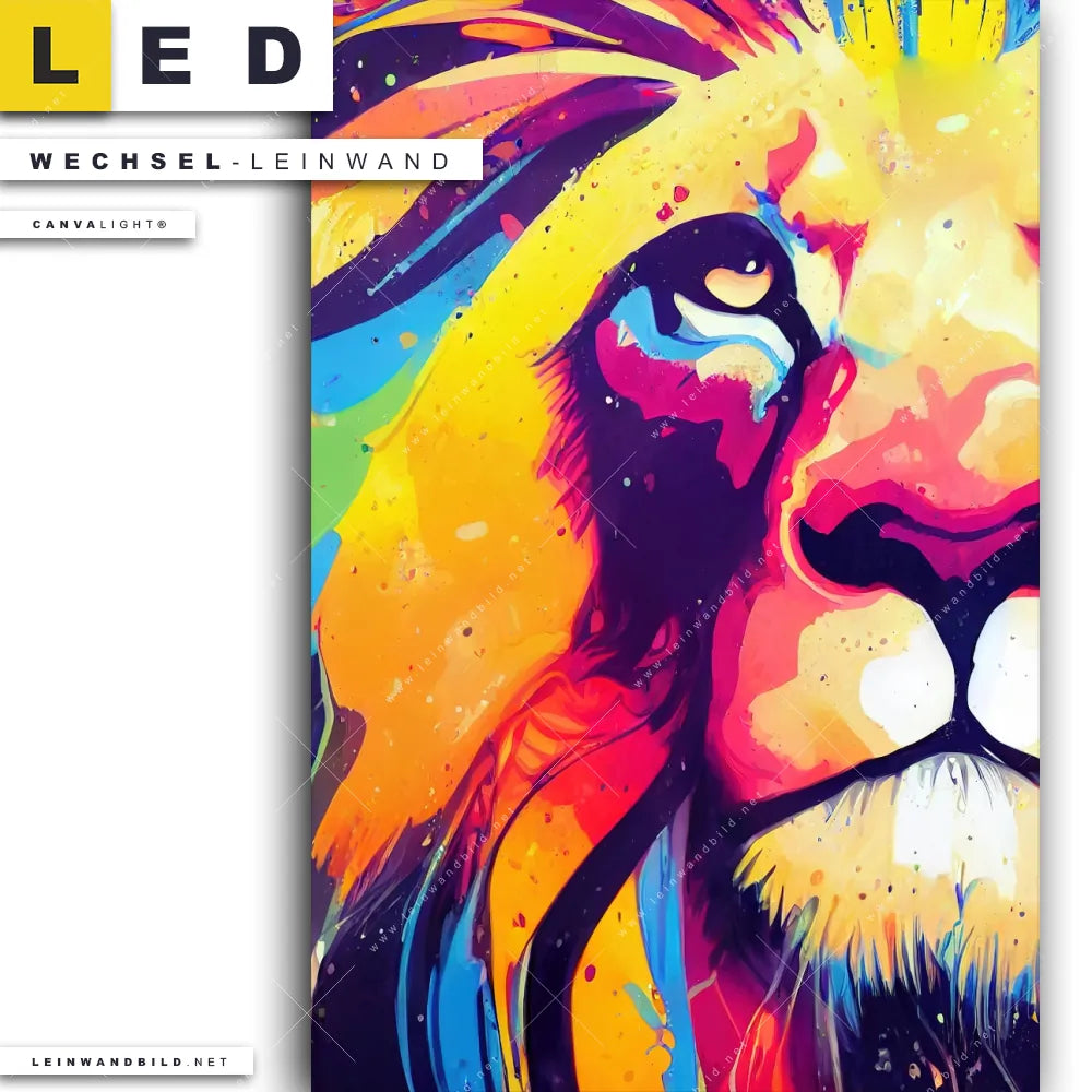 Dann sollte die Wechsel-Leinwand Canvalight® TEX | Graffiti Löwe | Hochformat den Weg zu Dir finden. Die Austausch-Leinwand farbenprächtiger Löwenkopf - passend für unsere stufenlos dimmbaren, steckerfertigen Leinwandbilder im Leuchtrahmen mit Fernbedienung und optionaler Farbtemperatursteuerung - fügt sich als Eye-Catcher harmonisch in jedes Bar - Gastronomie, Wohnzimmer - Schlafzimmer, Flur - Eingangsbereich Raumkonzept ein.