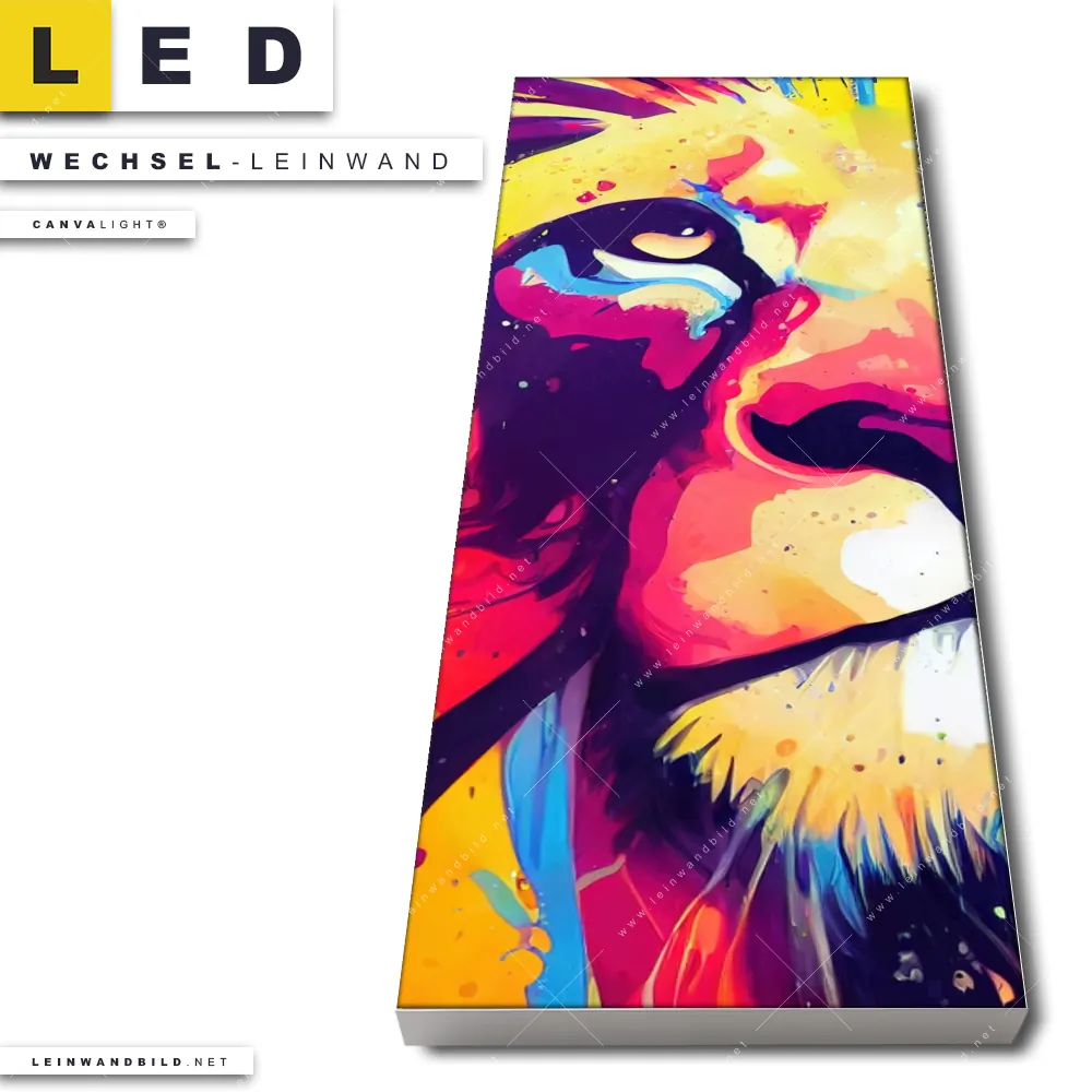 Du bist auf der Suche nach einer Tierwelt Wechsel-Leinwand für Dein LED-Leinwandbild im Schmalen Format? Begriffe wie Raubkatze, Löwe, Afrika, Dschungel, Lion, Graffiti, Raubtier, Löwenkopf, Wildtier, Farbexplosion, Farbspritzer, Farbe, Portät haben Dich auf der Suche nach Deiner Ersatz-Leinwand für dein LED Wandbild im Panorama-Hochformat mit wechselbarer Leinwand inspiriert? Farben wie Blau, Pink, Orange dürfen auf Deinem neuen Wechselmotiv für Dein XXL Leinwand-LED-Bild nicht fehlen und Leinwände im Abstrakt, Modern Art, Pop Art, Street Art Stil für Leuchtbilder passen perfekt zu Deinem Einrichtungsstil?