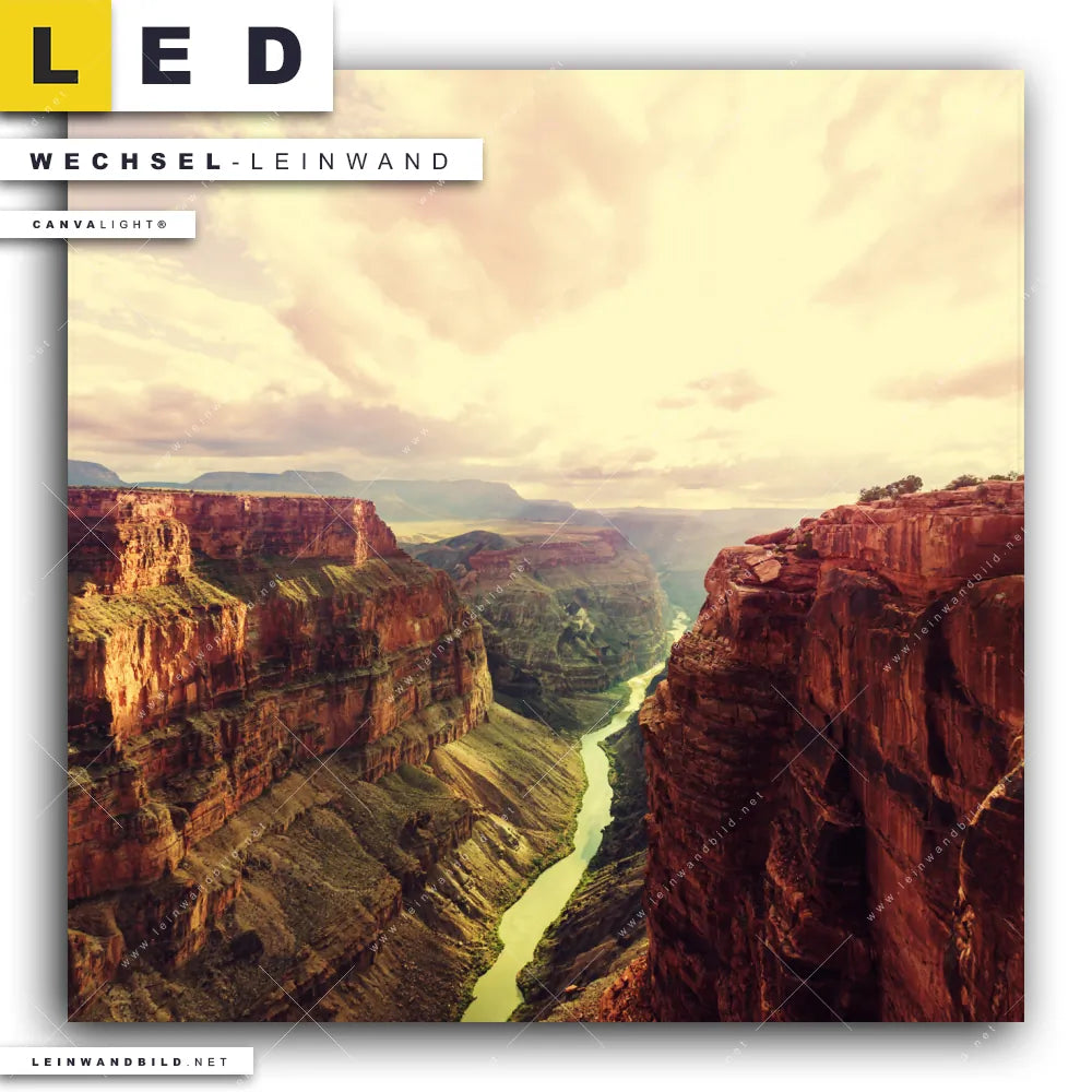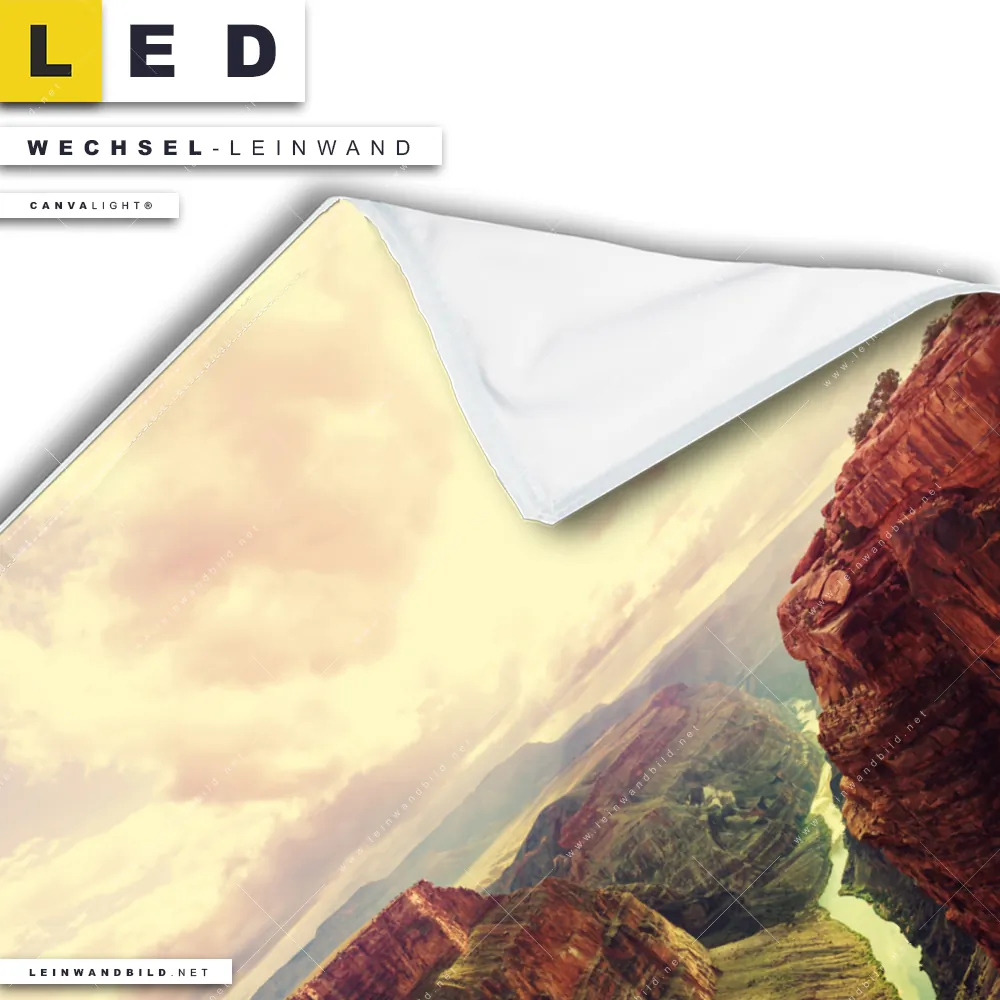 Dann sollte die Wechsel-Leinwand Canvalight® TEX | Grand Canyon Landschaft | Quadrat den Weg zu Dir finden. Die Austausch-Leinwand Grand Canyon Nationalpark - passend für unsere stufenlos dimmbaren, steckerfertigen Leinwandbilder im Leuchtrahmen mit Fernbedienung und optionaler Farbtemperatursteuerung - fügt sich als Eye-Catcher harmonisch in jedes Wohnzimmer - Schlafzimmer, Flur - Eingangsbereich, Büro - Kanzlei, Arzt - Praxis Raumkonzept ein.