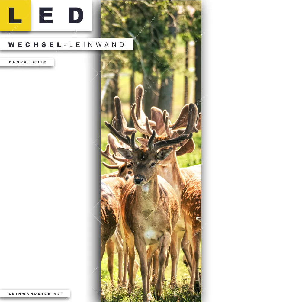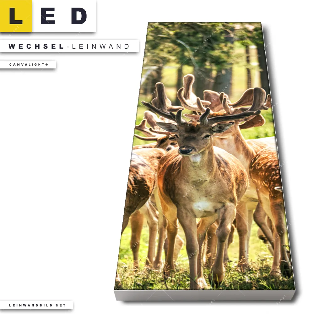 Dann sollte die Wechsel-Leinwand Canvalight® TEX | Gruppe Rotwild | Schmal den Weg zu Dir finden. Die Austausch-Leinwand Wildherde - passend für unsere stufenlos dimmbaren, steckerfertigen Leinwandbilder im LED Leuchtrahmen mit Fernbedienung und optionaler Farbtemperatursteuerung - fügt sich als Eye-Catcher harmonisch in jedes Arzt - Praxis, Bar - Gastronomie, Büro - Kanzlei, Wohnzimmer - Schlafzimmer, Flur - Eingangsbereich Raumkonzept ein.