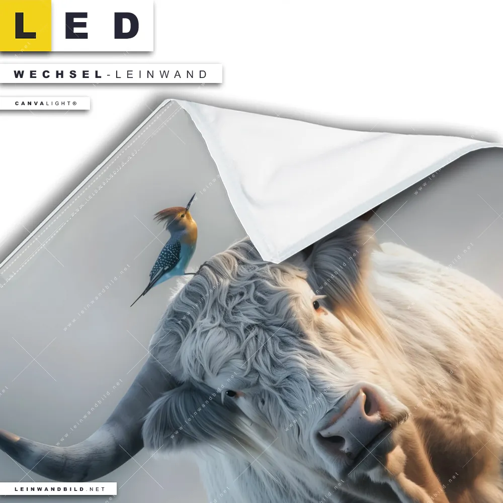 Dann sollte die Wechsel-Leinwand Canvalight® TEX | Hochlandrind & bunter Vogel | Quadrat den Weg zu Dir finden. Die Austausch-Leinwand Freundschaft in der Wildnis - passend für unsere stufenlos dimmbaren, steckerfertigen Leinwandbilder im Leuchtrahmen mit Fernbedienung und optionaler Farbtemperatursteuerung - fügt sich als Eye-Catcher harmonisch in jedes Bar - Gastronomie, Wohnzimmer - Schlafzimmer, Büro - Kanzlei Raumkonzept ein.