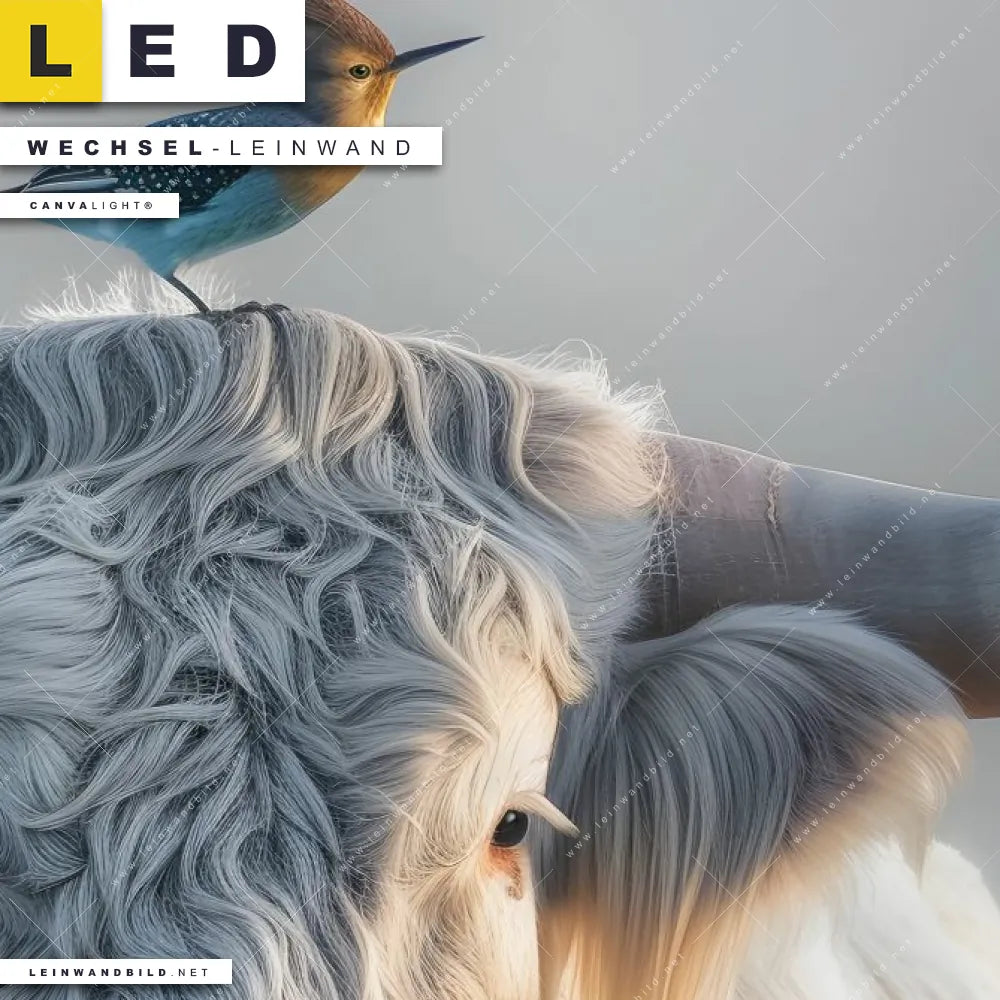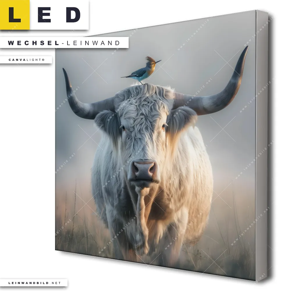 Du bist auf der Suche nach einer Tierwelt Wechsel-Leinwand für Dein LED-Leinwandbild im Quadratischen Format? Begriffe wie Tier, Stier, Hochlandkuh, Highlander, Büffel, Rind, Bulle, Hochlandrind, Wiese, Weide, Hörner, Vogel haben Dich auf der Suche nach Deiner Ersatz-Leinwand für dein LED Wandbild mit wechselbarer Leinwand inspiriert? Farben wie Grau , Beige dürfen auf Deinem neuen Wechselmotiv für Dein XXL Leinwand-LED-Bild nicht fehlen und Leinwände im Natürlich - Realistisch, Modern Art, Schwarz - Weiss Stil für Leuchtbilder passen perfekt zu Deinem Einrichtungsstil?