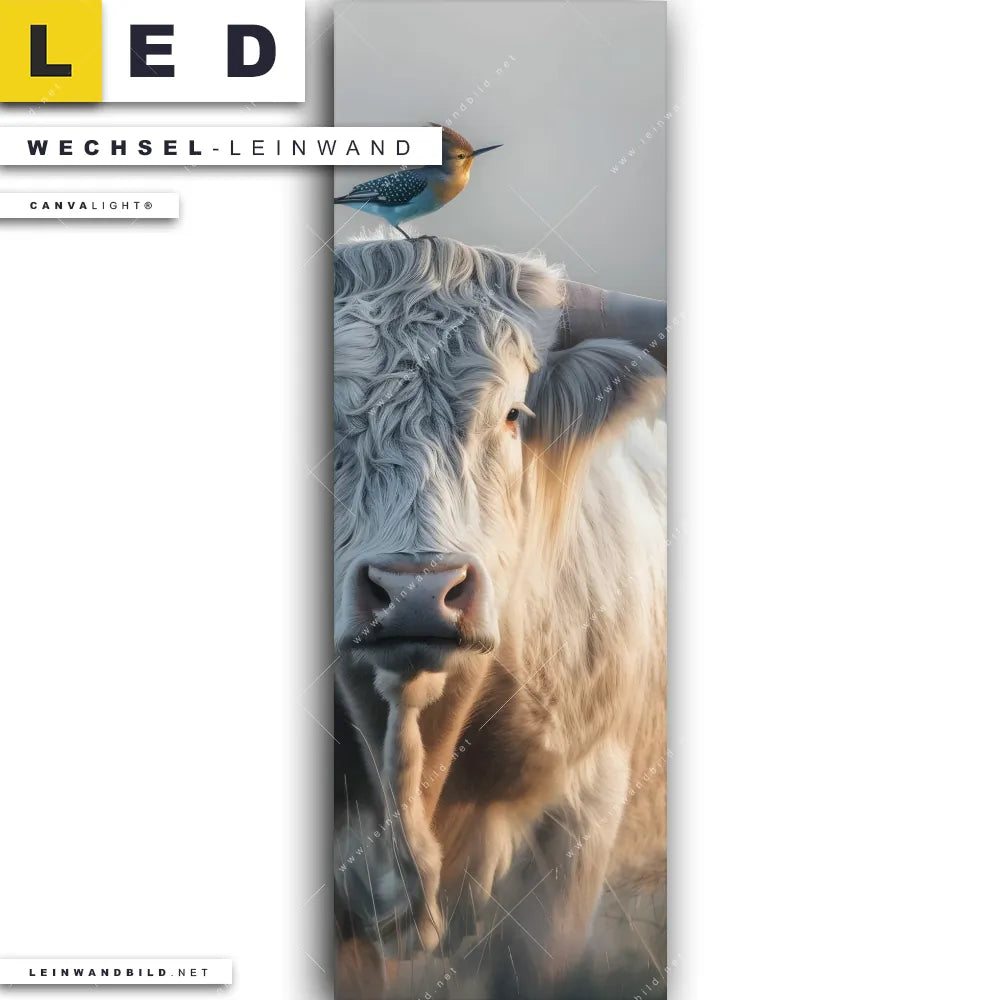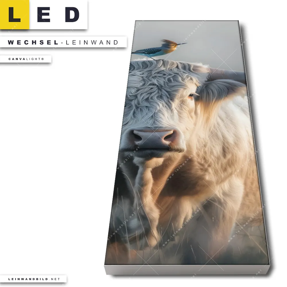 Dann sollte die Wechsel-Leinwand Canvalight® TEX | Hochlandrind & bunter Vogel | Schmal den Weg zu Dir finden. Die Austausch-Leinwand Stier und Vogel - passend für unsere stufenlos dimmbaren, steckerfertigen Leinwandbilder im LED Leuchtrahmen mit Fernbedienung und optionaler Farbtemperatursteuerung - fügt sich als Eye-Catcher harmonisch in jedes Bar - Gastronomie, Wohnzimmer - Schlafzimmer, Büro - Kanzlei Raumkonzept ein.