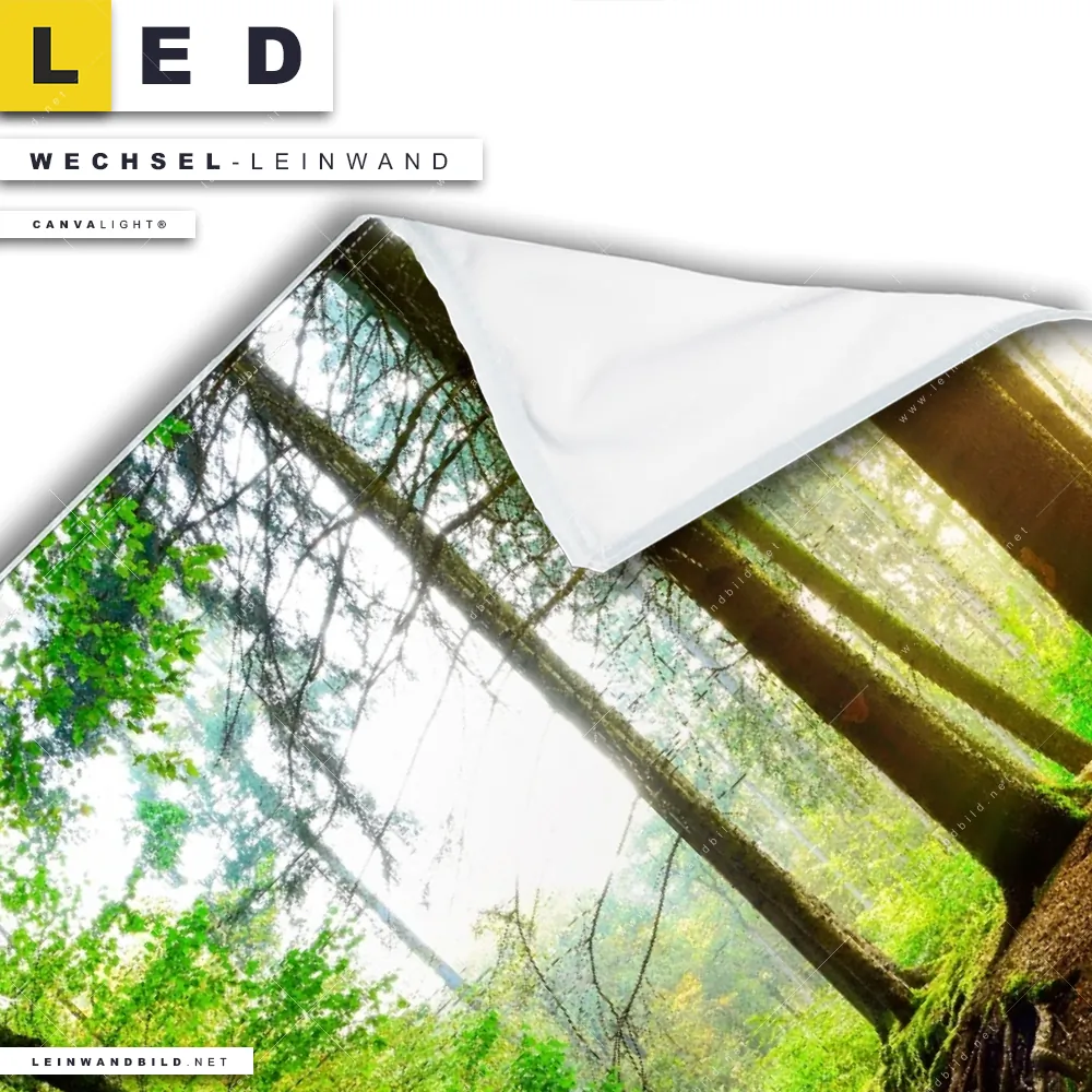 LED Wechsel-Leinwand Canvalight® TEX | Idyllischer Wald bei Sonnenaufgang | Quadrat