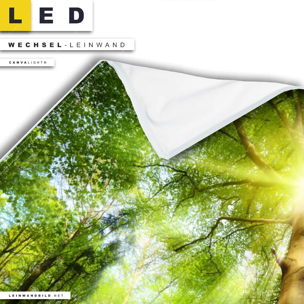 Du konfigurierst Deine individuelle LED Wechsel-Leinwand Canvalight® TEX | Im frischen grünen Wald | Hochformat und wir produzieren sie NEU für Dich. Unsere Landschaften, Wald - Bäume Austausch-Fotoleinwände für Canvalight® LED Bilder sind KEINE Lagerware. Du bist Dir unsicher, welches Motiv oder Format das richtige für dein individuelles LED Wechselmotiv auf Leinwand ist, dann helfen wir dir gerne weiter und beraten dich!