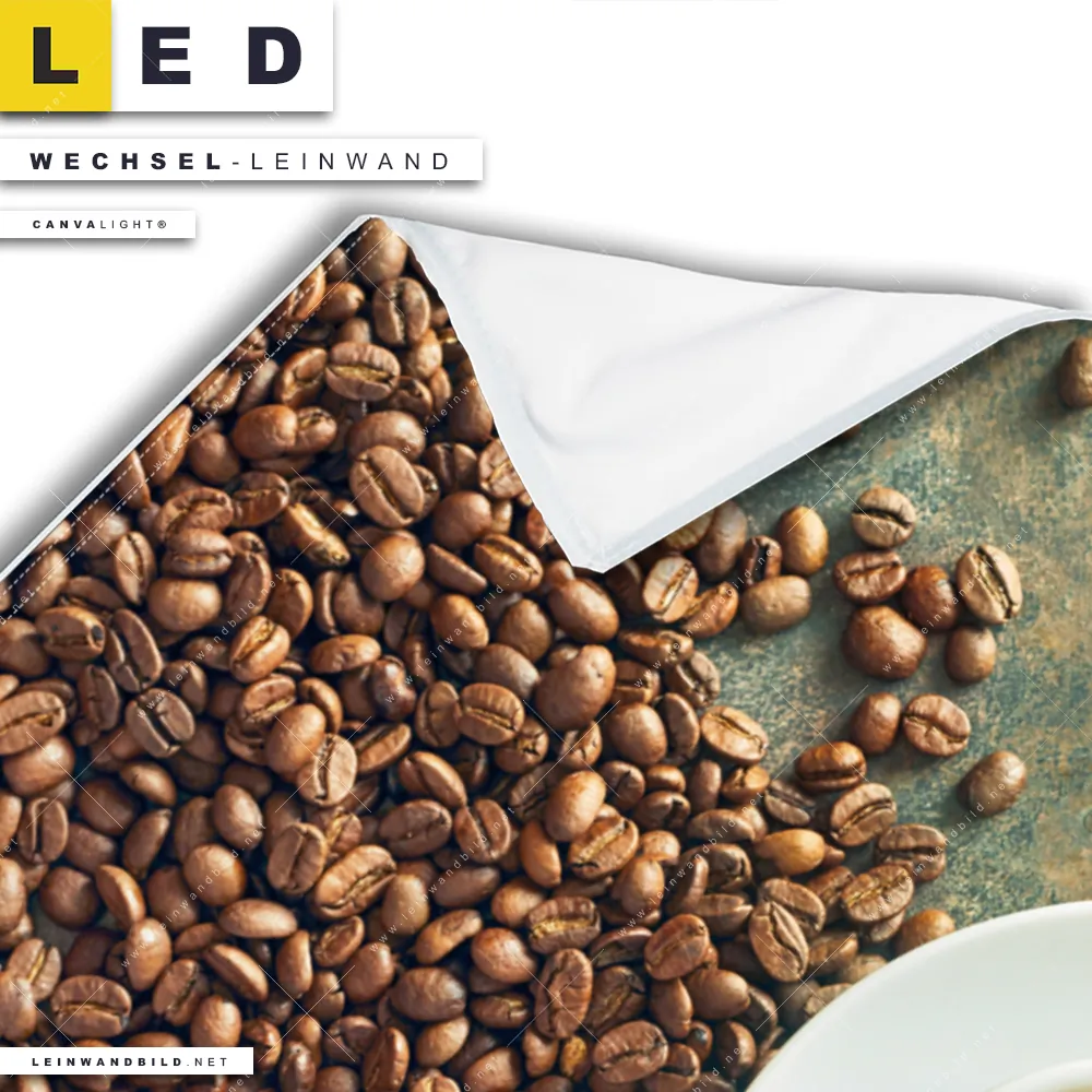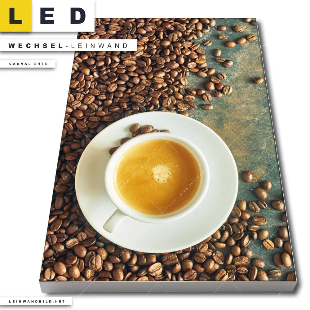 Du konfigurierst Deine individuelle LED Wechsel-Leinwand Canvalight® TEX | Kaffee-Genuss | Hochformat und wir produzieren sie NEU für Dich. Unsere Essen - Trinken Austausch-Fotoleinwände für Canvalight® LED Bilder sind KEINE Lagerware. Du bist Dir unsicher, welches Motiv oder Format das richtige für dein individuelles LED Wechselmotiv auf Leinwand ist, dann helfen wir dir gerne weiter und beraten dich!