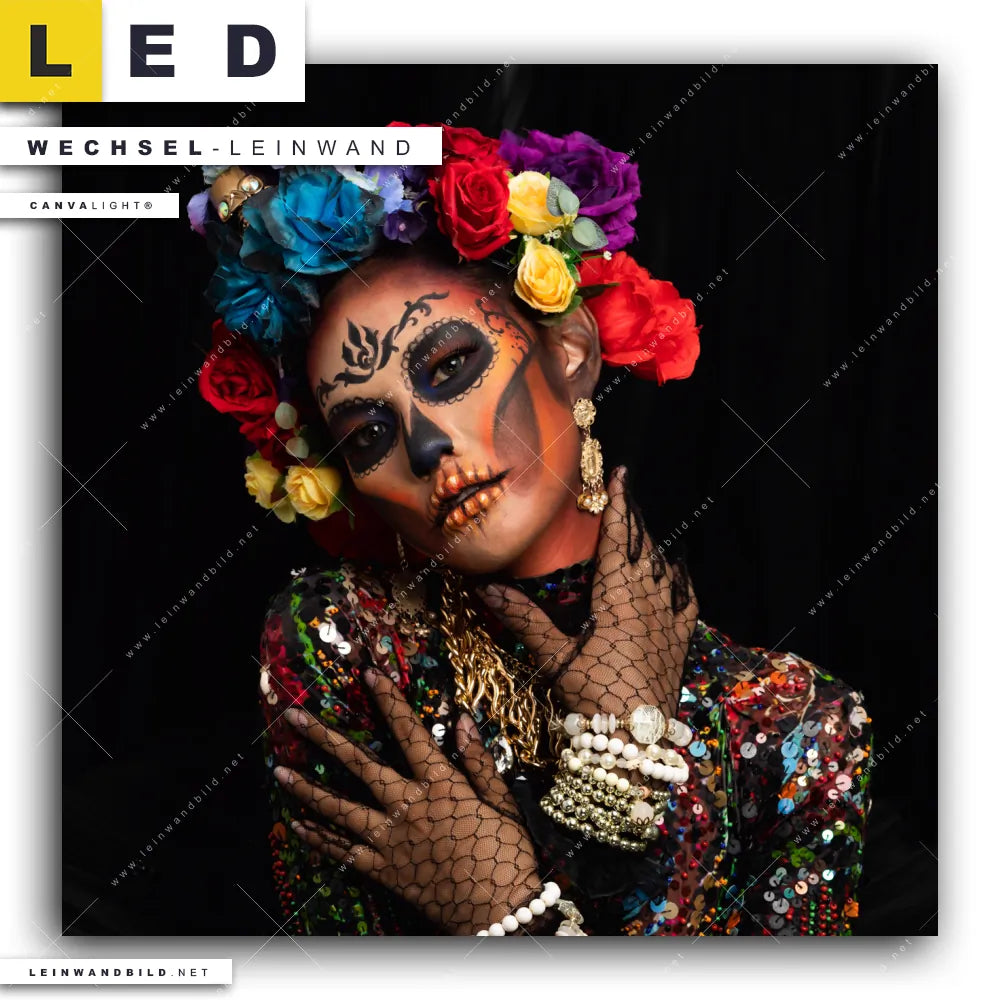 Du bist auf der Suche nach einer Porträts - Menschen Wechsel-Leinwand für Dein LED-Leinwandbild im Quadratischen Format? Begriffe wie Frau, Porträt, modern, Beauty, Gesicht, Körper, Make-up, Totenkopf, Schädel, Halloween, Tag der Toten, Santa Muerte, Blumen haben Dich auf der Suche nach Deiner Ersatz-Leinwand für dein LED Wandbild mit wechselbarer Leinwand inspiriert? Farben wie Schwarz, Weiss, Orange dürfen auf Deinem neuen Wechselmotiv für Dein XXL Leinwand-LED-Bild nicht fehlen und Leinwände im Modern Art, Schwarz - Weiss Stil für Leuchtbilder passen perfekt zu Deinem Einrichtungsstil?