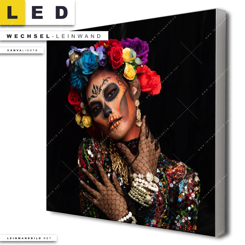 Dann sollte die Wechsel-Leinwand Canvalight® TEX | La Calavera Catrina No.2 | Quadrat den Weg zu Dir finden. Die Austausch-Leinwand Frau mit Blumenverzierungen - passend für unsere stufenlos dimmbaren, steckerfertigen Leinwandbilder im Leuchtrahmen mit Fernbedienung und optionaler Farbtemperatursteuerung - fügt sich als Eye-Catcher harmonisch in jedes Bar - Gastronomie, Friseur - Beauty, Wohnzimmer - Schlafzimmer Raumkonzept ein.