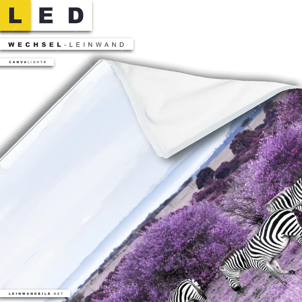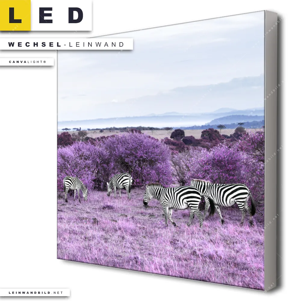 Dann sollte die Wechsel-Leinwand Canvalight® TEX | Lila Savanne | Quadrat den Weg zu Dir finden. Die Austausch-Leinwand Zebras mit lila Gräsern - passend für unsere stufenlos dimmbaren, steckerfertigen Leinwandbilder im Leuchtrahmen mit Fernbedienung und optionaler Farbtemperatursteuerung - fügt sich als Eye-Catcher harmonisch in jedes Wohnzimmer - Schlafzimmer, Flur - Eingangsbereich, Bar - Gastronomie Raumkonzept ein.