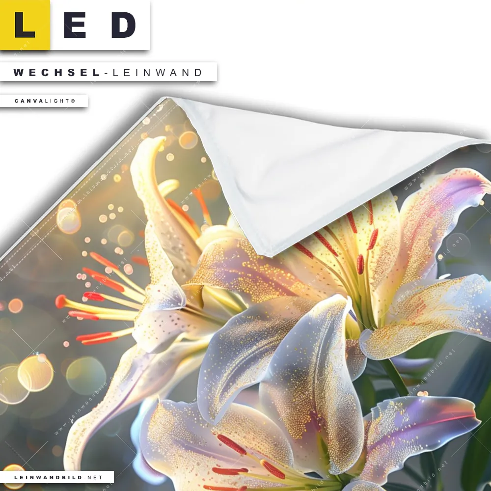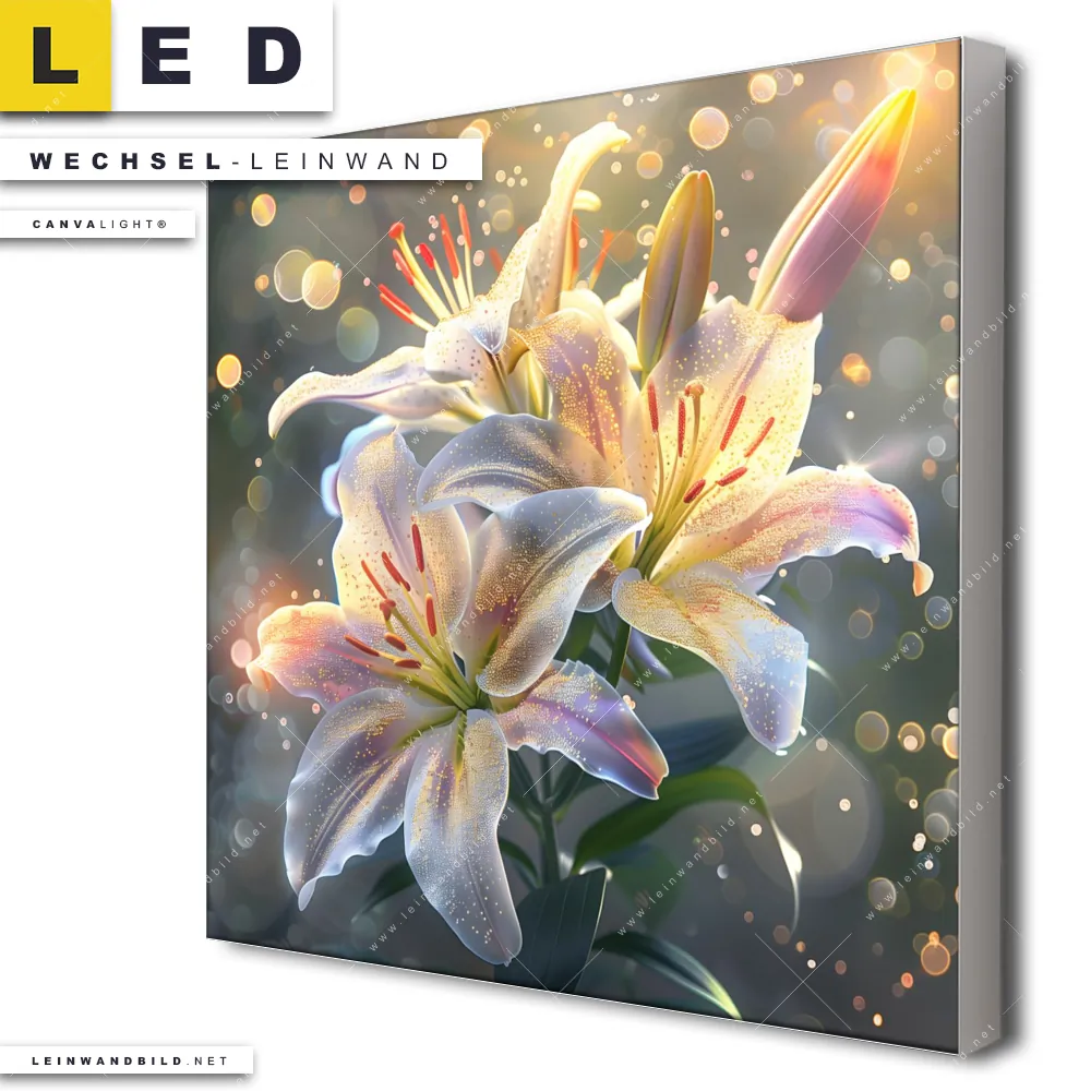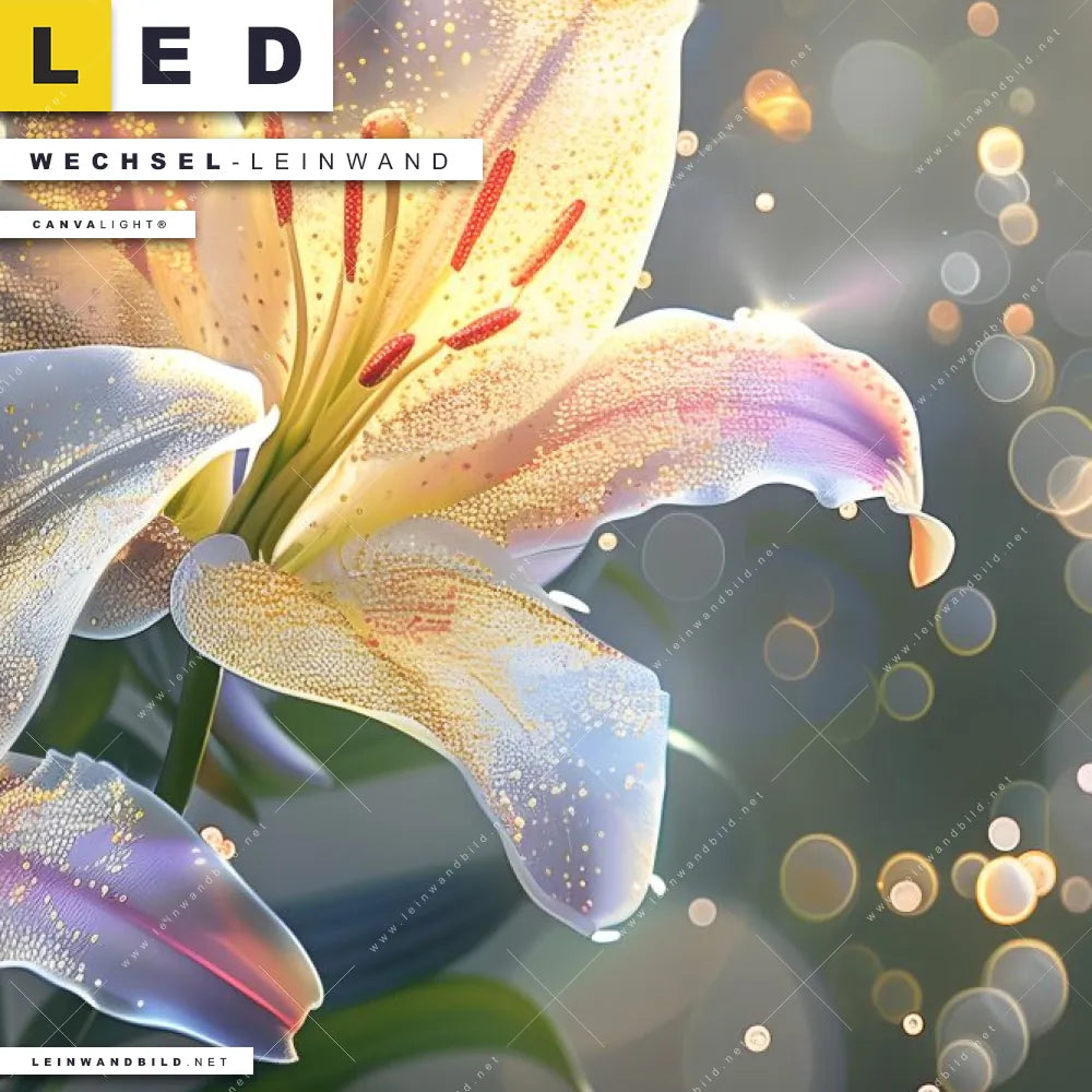 Du bist auf der Suche nach einer Blumen - Botanik Wechsel-Leinwand für Dein LED-Leinwandbild im Quadratischen Format? Begriffe wie Blumen, Pflanze, Natur, Blüten, Glitzer, Sonnenlicht, Lilien, Frühling haben Dich auf der Suche nach Deiner Ersatz-Leinwand für dein LED Wandbild mit wechselbarer Leinwand inspiriert? Farben wie Weiss, Rosa dürfen auf Deinem neuen Wechselmotiv für Dein XXL Leinwand-LED-Bild nicht fehlen und Leinwände im Floral, Modern Art Stil für Leuchtbilder passen perfekt zu Deinem Einrichtungsstil?