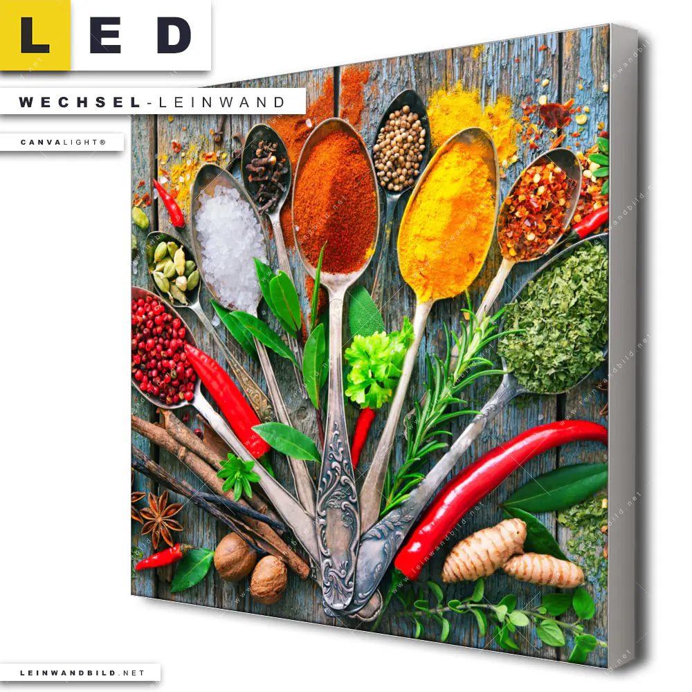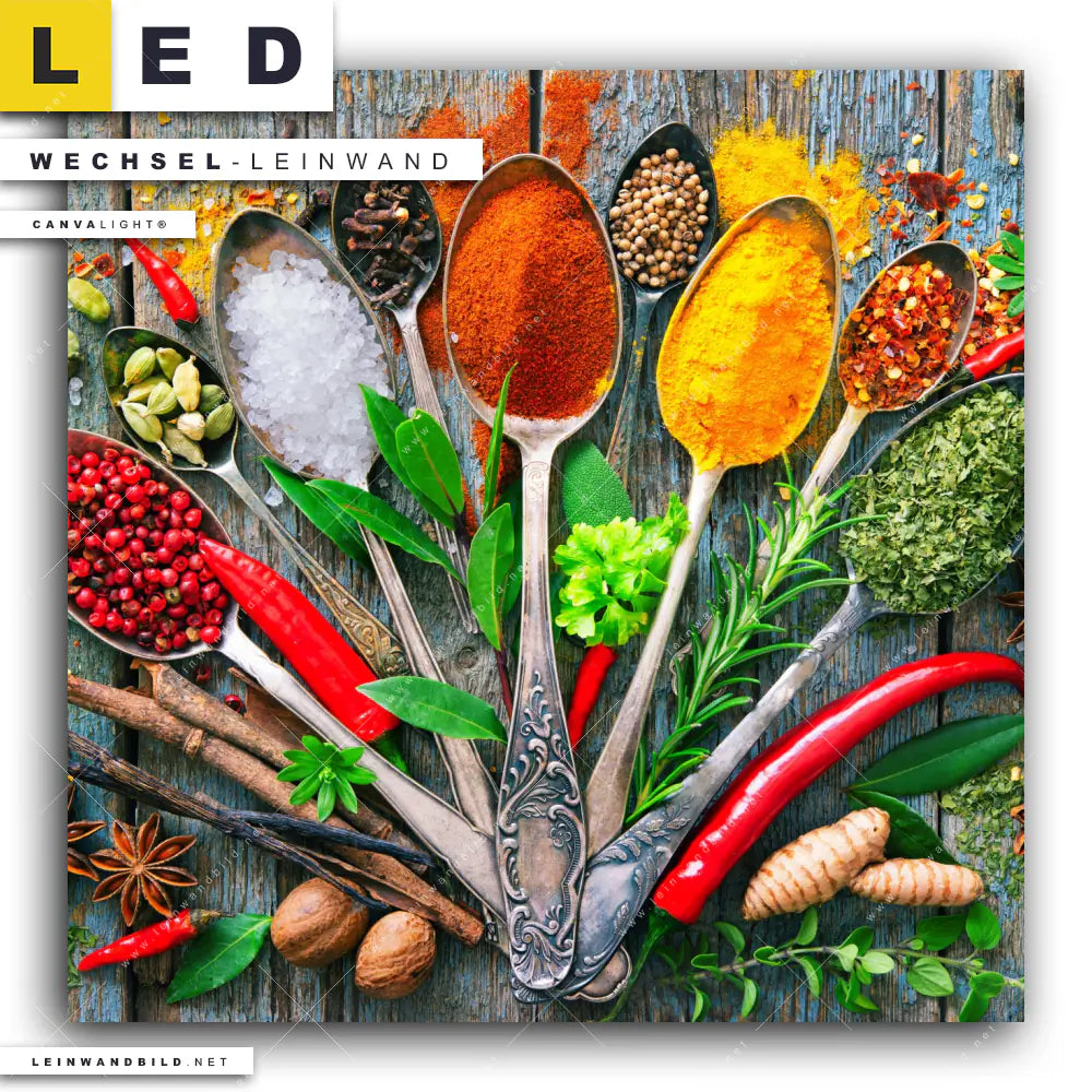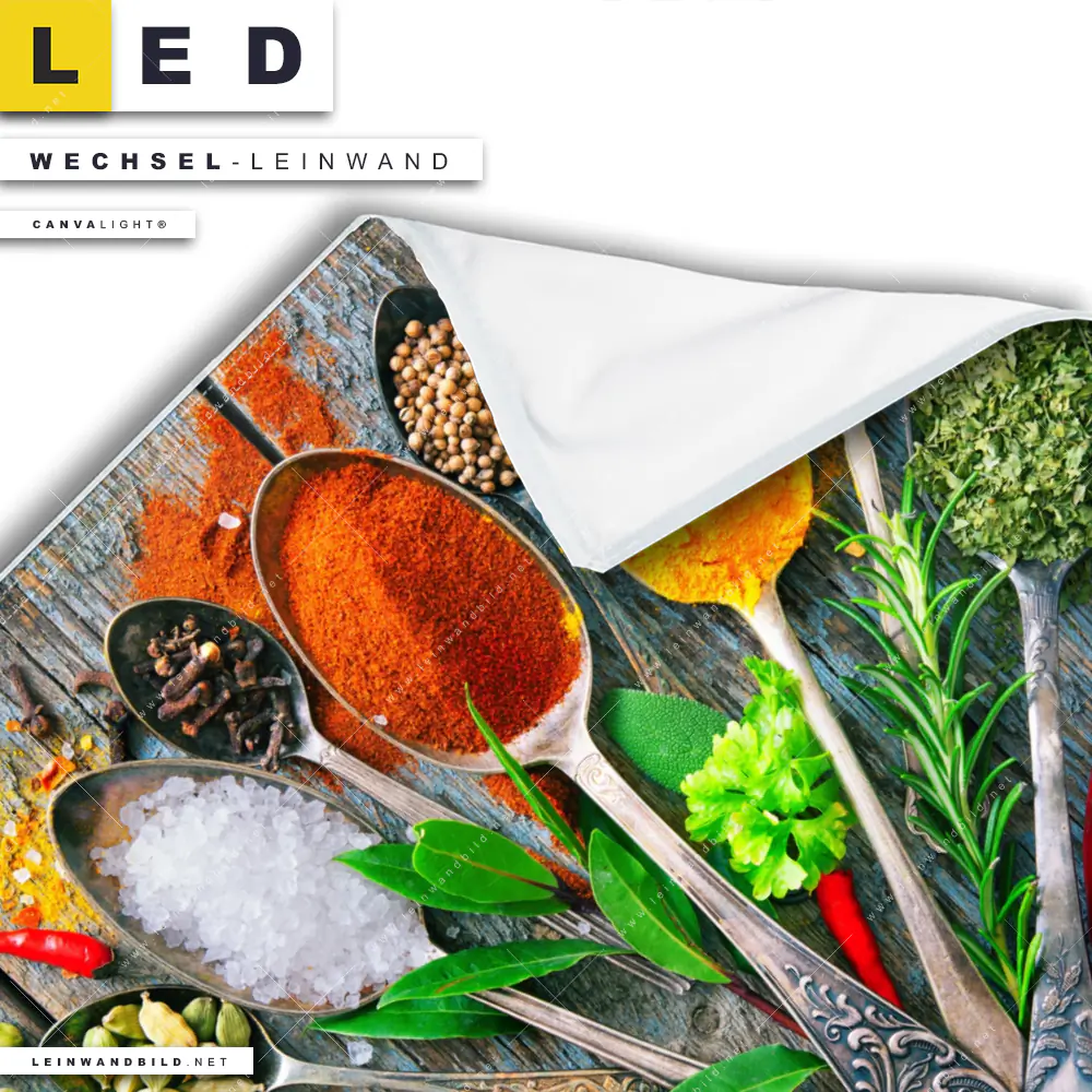 LED Wechsel-Leinwand Canvalight® TEX | Löffel mit Kräutern und Gewürzen | Quadrat