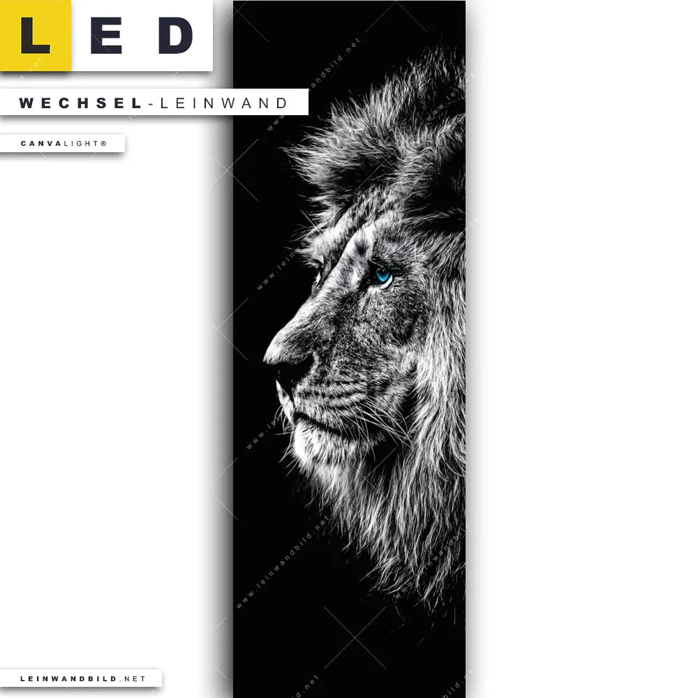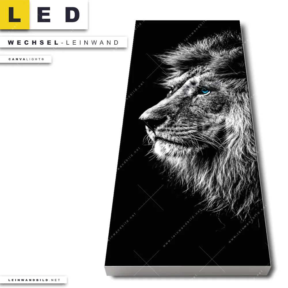 Du konfigurierst Deine individuelle LED Wechsel-Leinwand Canvalight® TEX | Löwe mit blauen Augen | Schmal und wir produzieren sie NEU für Dich. Unsere Tierwelt Austausch-Fotoleinwände für Canvalight® LED Bilder sind KEINE Lagerware. Du bist Dir unsicher, welches Motiv oder Format das richtige für dein individuelles LED Wechselmotiv auf Leinwand ist, dann helfen wir dir gerne weiter und beraten dich!