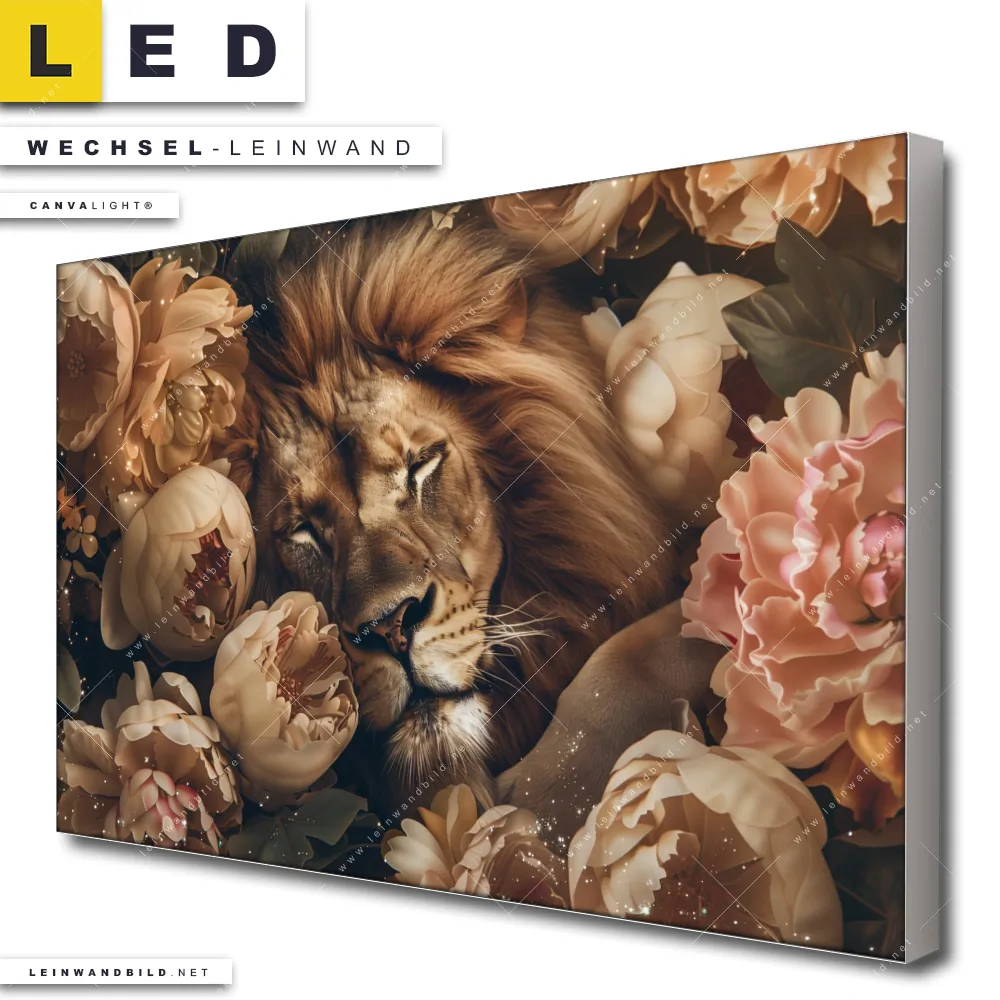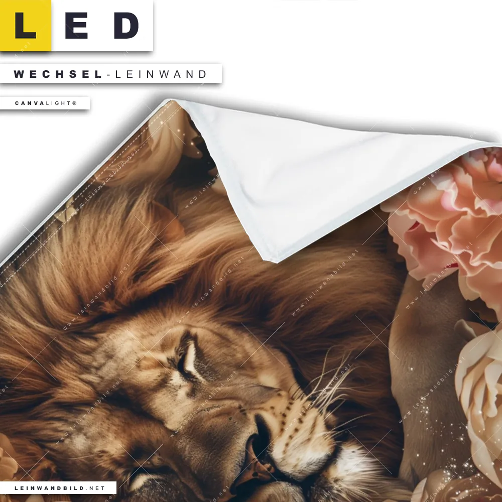LED Wechsel-Leinwand Canvalight® TEX | Löwe schläft in Blüten | Querformat