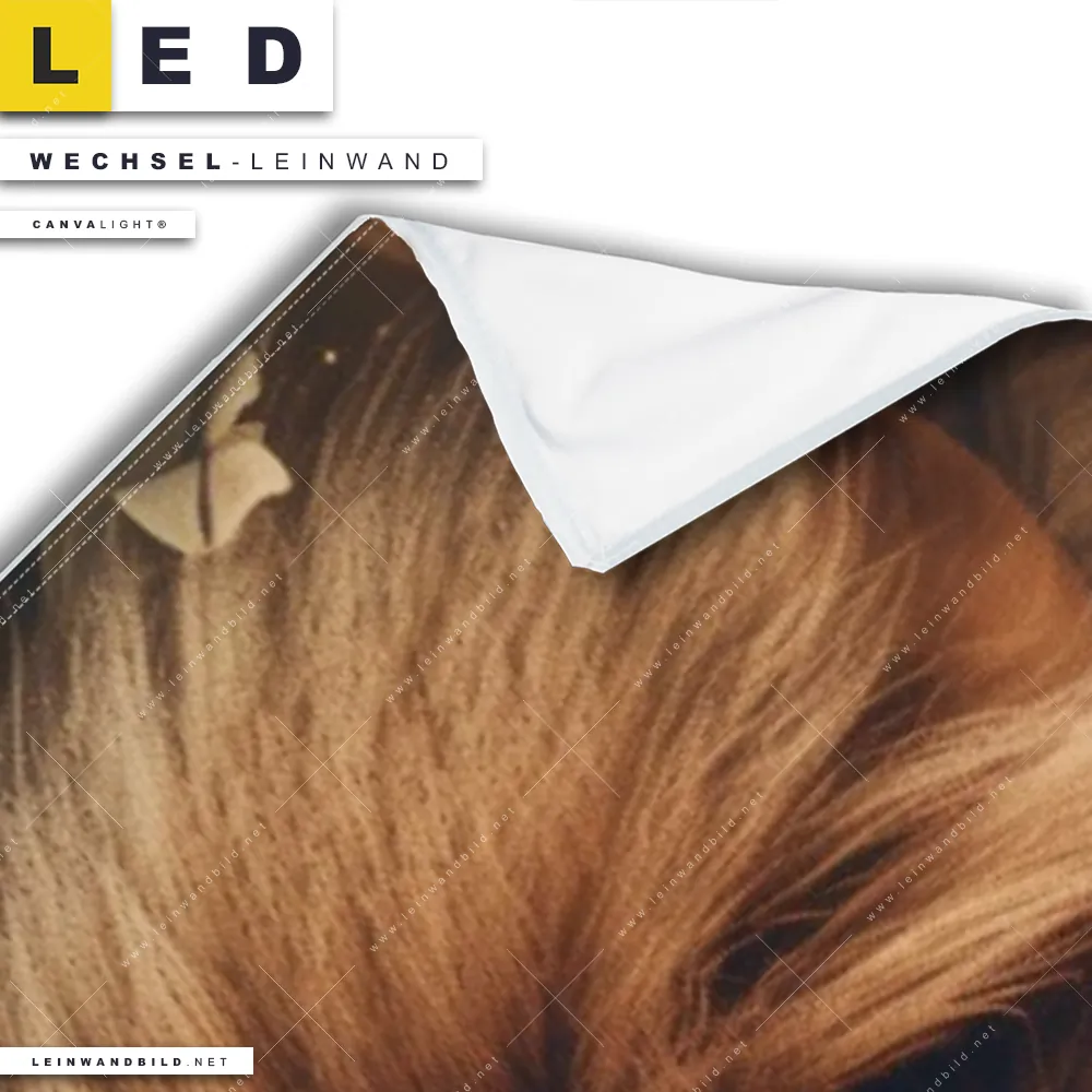 Bitte beachte, dass die Farben, der auf dem Monitor abgebildeten Blüten und Löwenporträt Darstellung, möglicherweise von den Originalfarben deiner Canvalight® TEX Wechsel-Leinwand abweichen können.