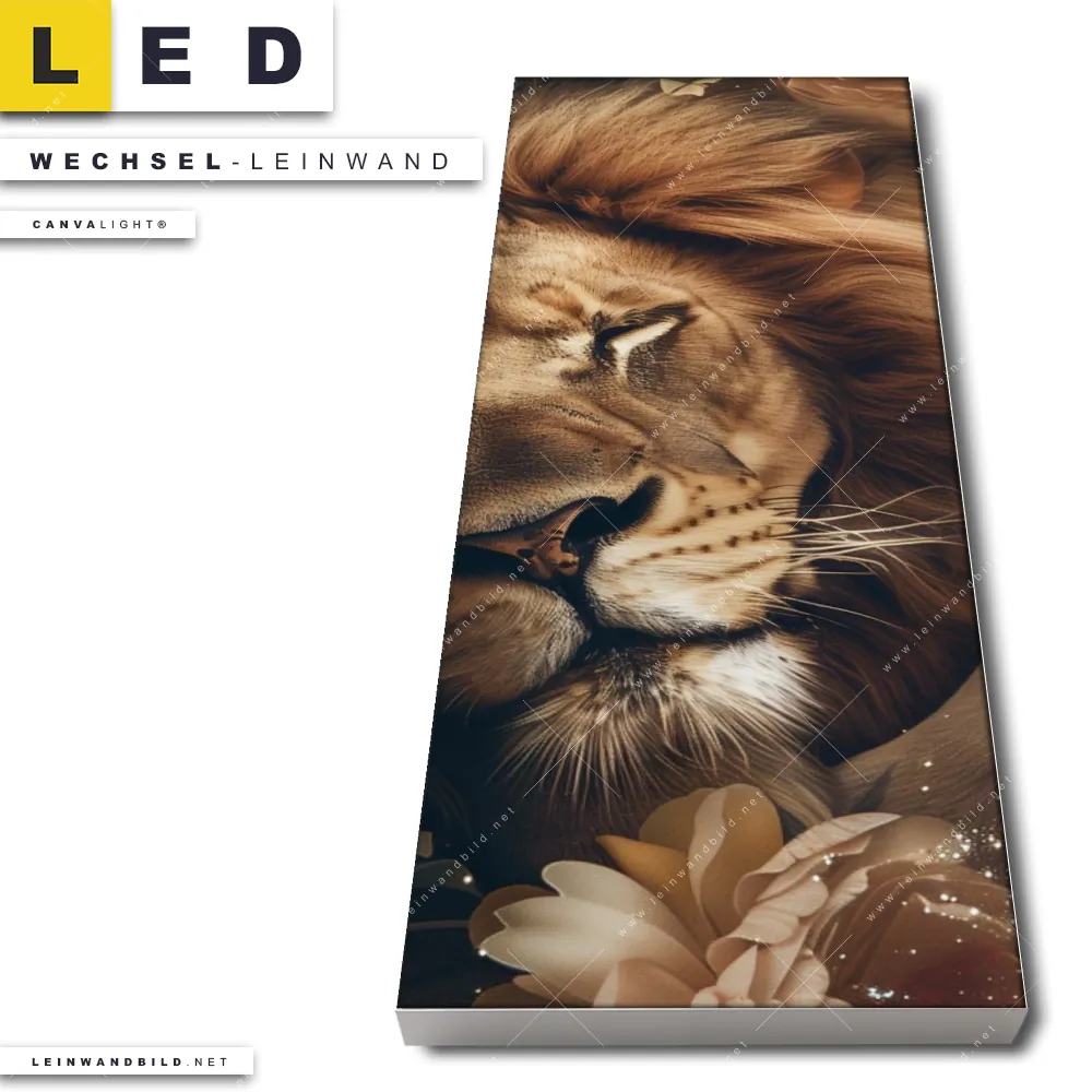 Du konfigurierst Deine individuelle LED Wechsel-Leinwand Canvalight® TEX | Löwe schläft in Blüten | Schmal und wir produzieren sie NEU für Dich. Unsere Tierwelt, Blumen - Botanik Austausch-Fotoleinwände für Canvalight® LED Bilder sind KEINE Lagerware. Du bist Dir unsicher, welches Motiv oder Format das richtige für dein individuelles LED Wechselmotiv auf Leinwand ist, dann helfen wir dir gerne weiter und beraten dich!