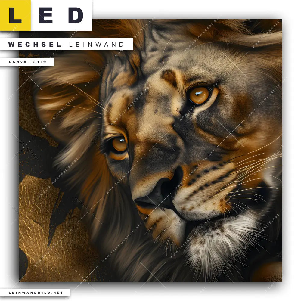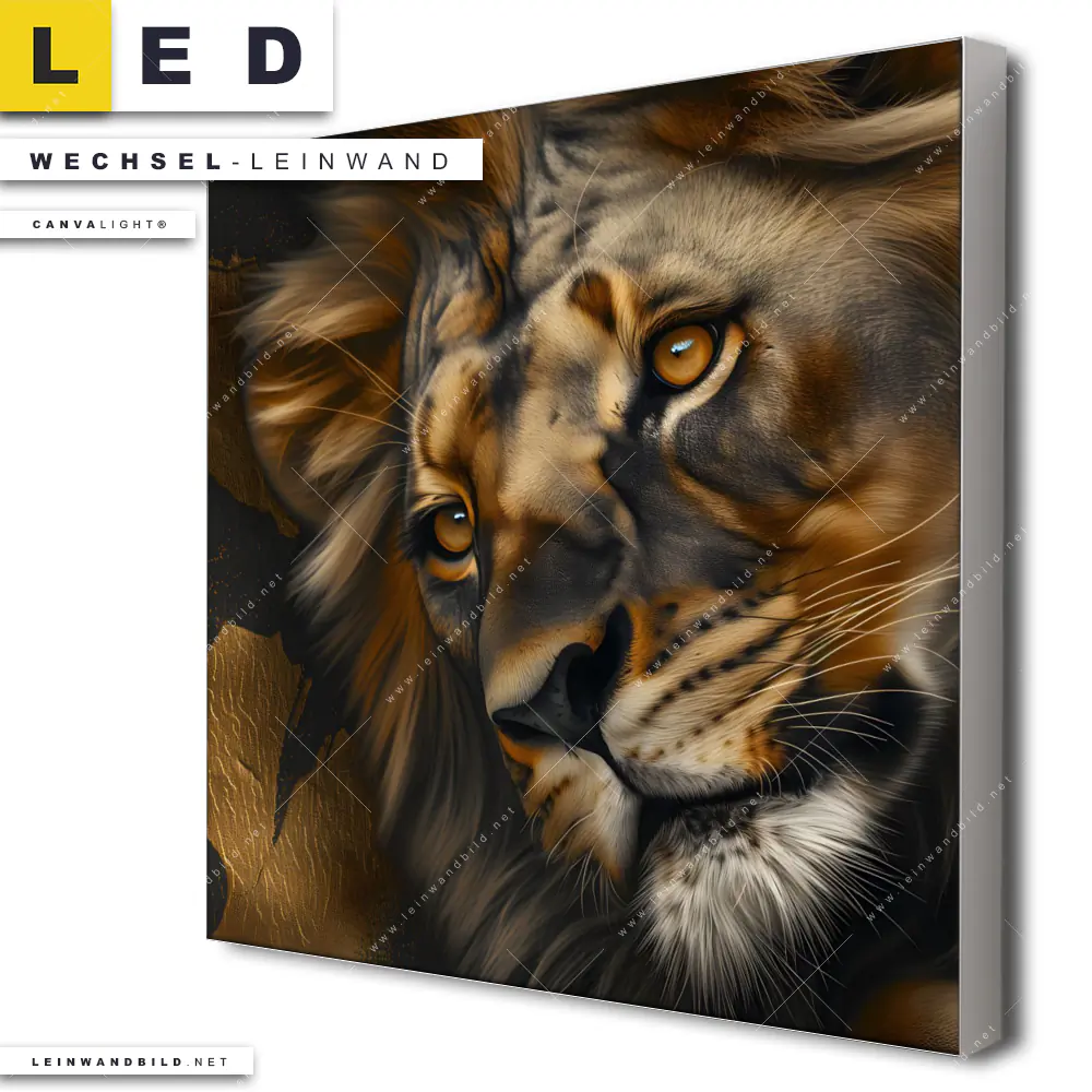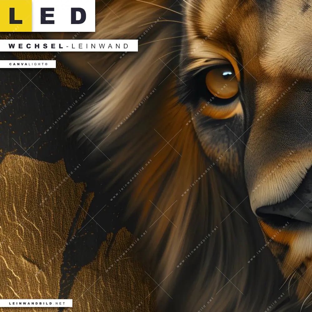 Dann sollte die Wechsel-Leinwand Canvalight® TEX | Löwenportrait: Kraft und Eleganz | Quadrat den Weg zu Dir finden. Die Austausch-Leinwand Löwe vor goldener Textur - passend für unsere stufenlos dimmbaren, steckerfertigen Leinwandbilder im Leuchtrahmen mit Fernbedienung und optionaler Farbtemperatursteuerung - fügt sich als Eye-Catcher harmonisch in jedes Wohnzimmer - Schlafzimmer, Büro - Kanzlei, Flur - Eingangsbereich Raumkonzept ein.