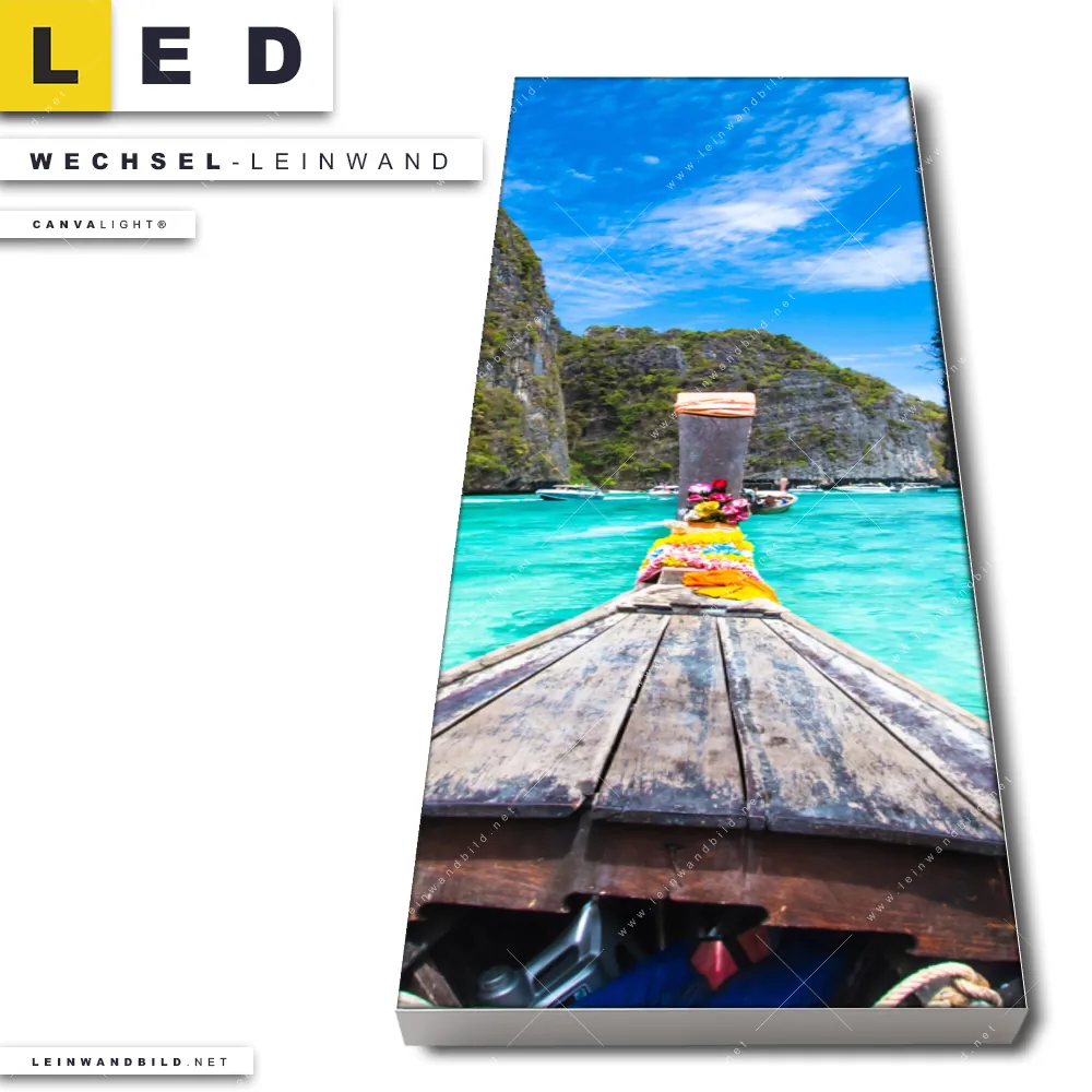 Du konfigurierst Deine individuelle LED Wechsel-Leinwand Canvalight® TEX | Longtail-Boot | Schmal und wir produzieren sie NEU für Dich. Unsere Landschaften, Strand - Meer Austausch-Fotoleinwände für Canvalight® LED Bilder sind KEINE Lagerware. Du bist Dir unsicher, welches Motiv oder Format das richtige für dein individuelles LED Wechselmotiv auf Leinwand ist, dann helfen wir dir gerne weiter und beraten dich!