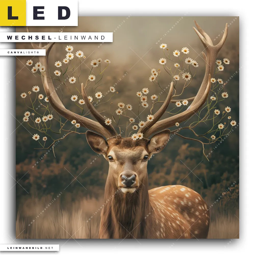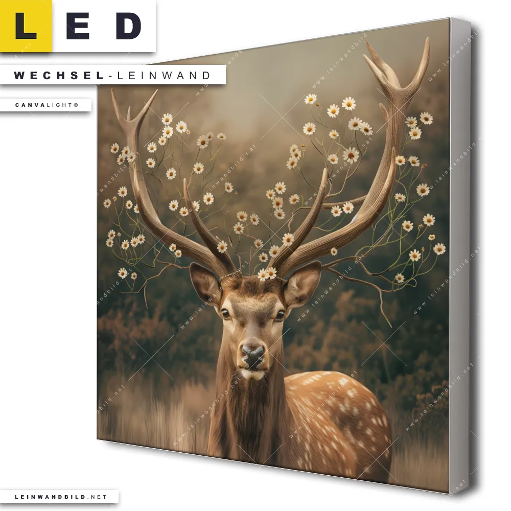 Du bist auf der Suche nach einer Tierwelt, Blumen - Botanik, Landschaften Wechsel-Leinwand für Dein LED-Leinwandbild im Quadratischen Format? Begriffe wie Hirsch, Gänseblümchen, Rotwild, Wald, Blüten, Geweih, Blumen, Rothirsch haben Dich auf der Suche nach Deiner Ersatz-Leinwand für dein LED Wandbild mit wechselbarer Leinwand inspiriert? Farben wie Beige, Braun, Weiss dürfen auf Deinem neuen Wechselmotiv für Dein XXL Leinwand-LED-Bild nicht fehlen und Leinwände im Floral, Retro - Vintage, Surreal - Fantasy Stil für Leuchtbilder passen perfekt zu Deinem Einrichtungsstil?