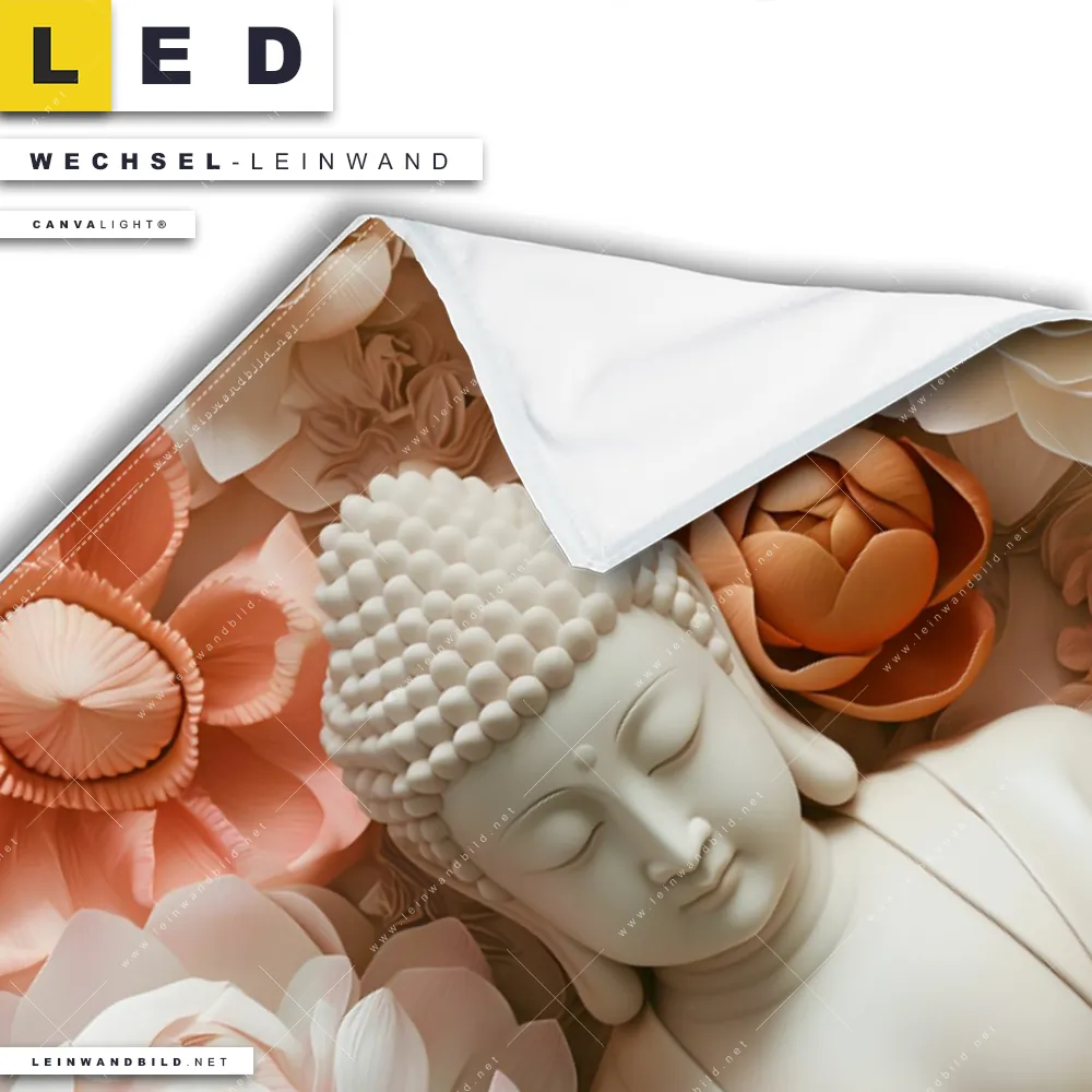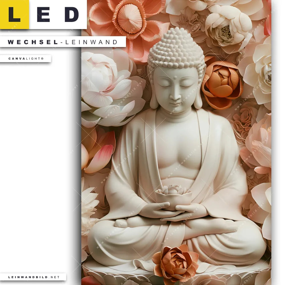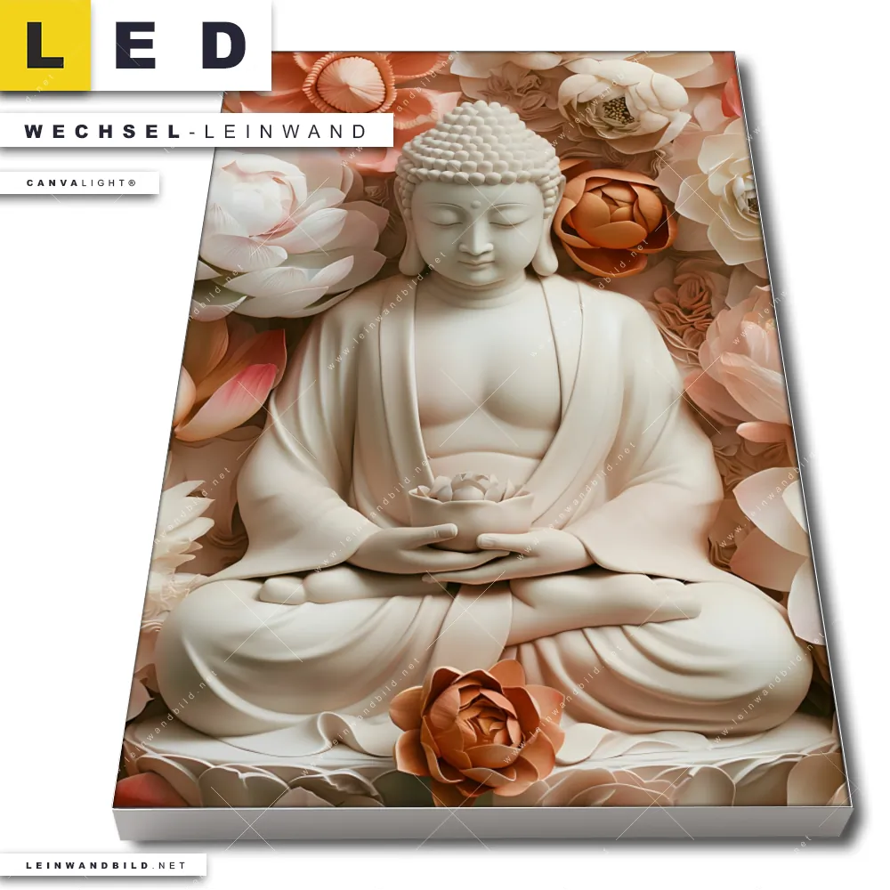 LED Wechsel-Leinwand Canvalight® TEX | Meditierender Buddha mit Blüten | Hochformat