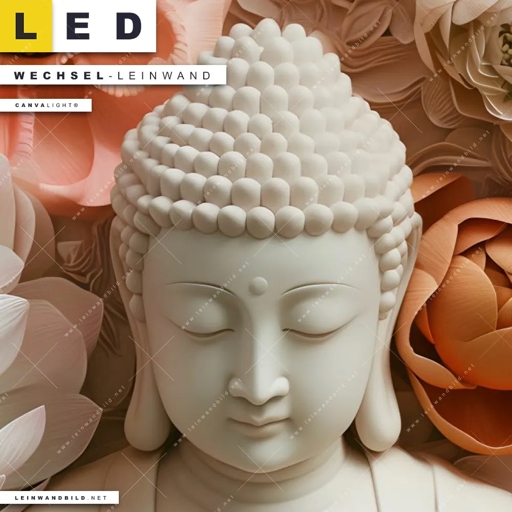 Du bist auf der Suche nach einer Buddha - Feng Shui, Blumen - Botanik Wechsel-Leinwand für Dein LED-Leinwandbild im Hochformat? Begriffe wie Statue, Buddha, Meditation, Buddhismus, Religion, Blumen, Spirituell haben Dich auf der Suche nach Deiner Ersatz-Leinwand für dein LED Wandbild mit wechselbarer Leinwand inspiriert? Farben wie Rosa, Weiss, Beige, Orange dürfen auf Deinem neuen Wechselmotiv für Dein XXL Leinwand-LED-Bild nicht fehlen und Leinwände im Modern Art, Floral Stil für Leuchtbilder passen perfekt zu Deinem Einrichtungsstil?