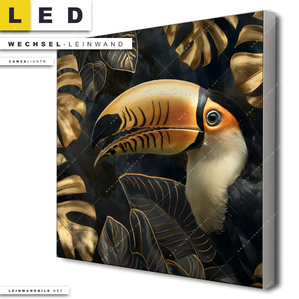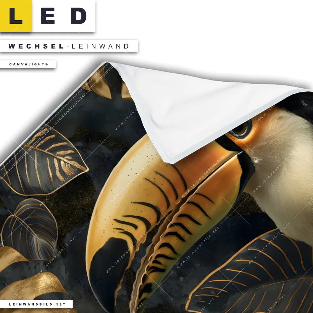 Du bist auf der Suche nach einer Tierwelt, Blumen - Botanik Wechsel-Leinwand für Dein LED-Leinwandbild im Quadratischen Format? Begriffe wie Tierporträt, Tier, Vogel, Tukan, Dschungel, Blätter, Palmenblätter haben Dich auf der Suche nach Deiner Ersatz-Leinwand für dein LED Wandbild mit wechselbarer Leinwand inspiriert? Farben wie Schwarz, Gold dürfen auf Deinem neuen Wechselmotiv für Dein XXL Leinwand-LED-Bild nicht fehlen und Leinwände im Minimalistisch, Schwarz - Weiss Stil für Leuchtbilder passen perfekt zu Deinem Einrichtungsstil?