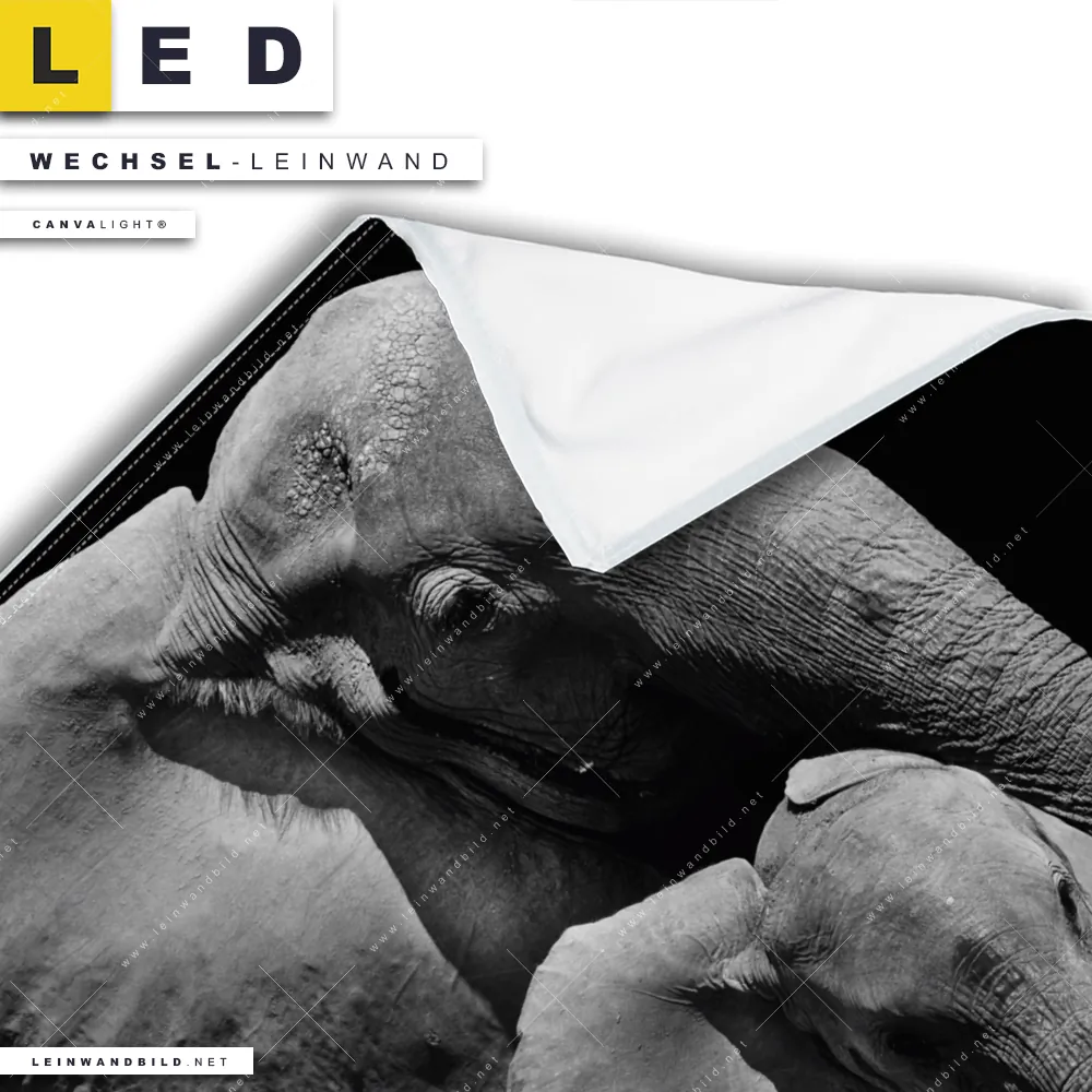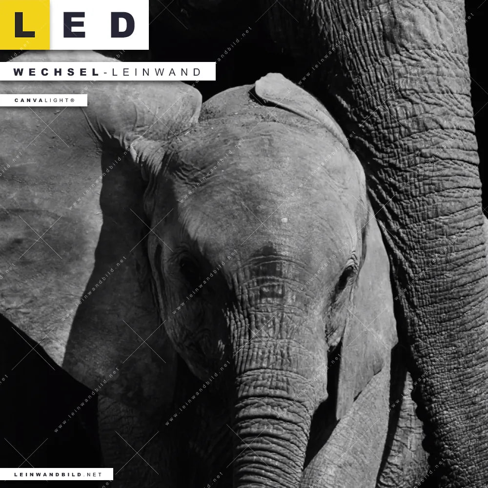 Du bist auf der Suche nach einer Tierwelt Wechsel-Leinwand für Dein LED-Leinwandbild im Quadratischen Format? Begriffe wie Afrika, wild, Safari, Elefant, Baby, Schutz, Dschungel haben Dich auf der Suche nach Deiner Ersatz-Leinwand für dein LED Wandbild mit wechselbarer Leinwand inspiriert? Farben wie Weiss, Schwarz dürfen auf Deinem neuen Wechselmotiv für Dein XXL Leinwand-LED-Bild nicht fehlen und Leinwände im Natürlich - Realistisch, Schwarz - Weiss Stil für Leuchtbilder passen perfekt zu Deinem Einrichtungsstil?