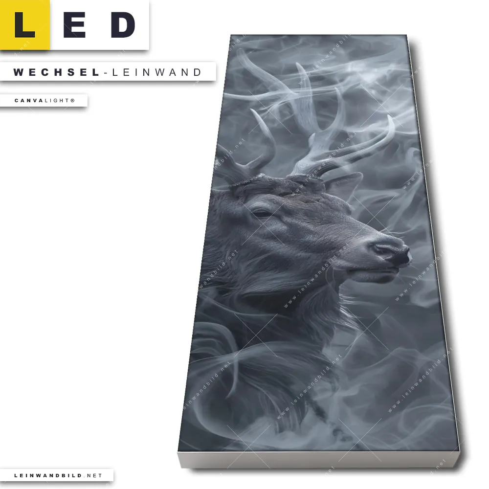 Dann sollte die Wechsel-Leinwand Canvalight® TEX | Mystischer Hirsch im Nebel | Schmal den Weg zu Dir finden. Die Austausch-Leinwand Magischer Hirsch mit Rauch - passend für unsere stufenlos dimmbaren, steckerfertigen Leinwandbilder im LED Leuchtrahmen mit Fernbedienung und optionaler Farbtemperatursteuerung - fügt sich als Eye-Catcher harmonisch in jedes Büro - Kanzlei, Wohnzimmer - Schlafzimmer, Flur - Eingangsbereich Raumkonzept ein.