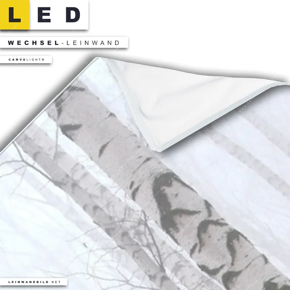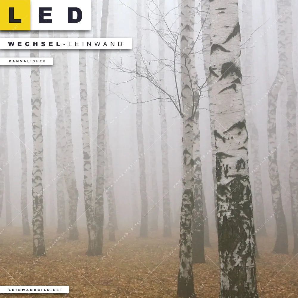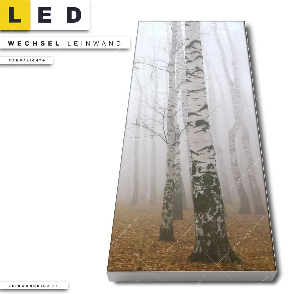 Du konfigurierst Deine individuelle LED Wechsel-Leinwand Canvalight® TEX | Nebel im Birkenwald | Schmal und wir produzieren sie NEU für Dich. Unsere Landschaften, Wald - Bäume Austausch-Fotoleinwände für Canvalight® LED Bilder sind KEINE Lagerware. Du bist Dir unsicher, welches Motiv oder Format das richtige für dein individuelles LED Wechselmotiv auf Leinwand ist, dann helfen wir dir gerne weiter und beraten dich!