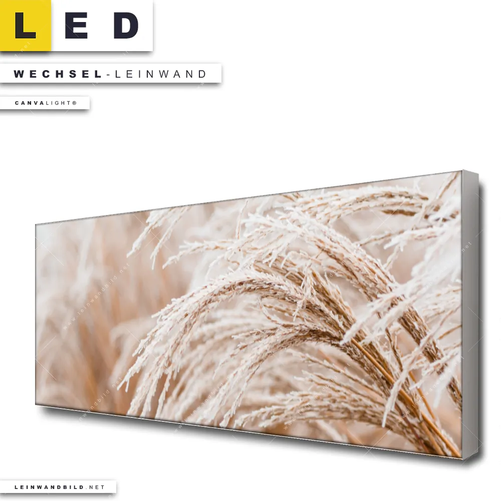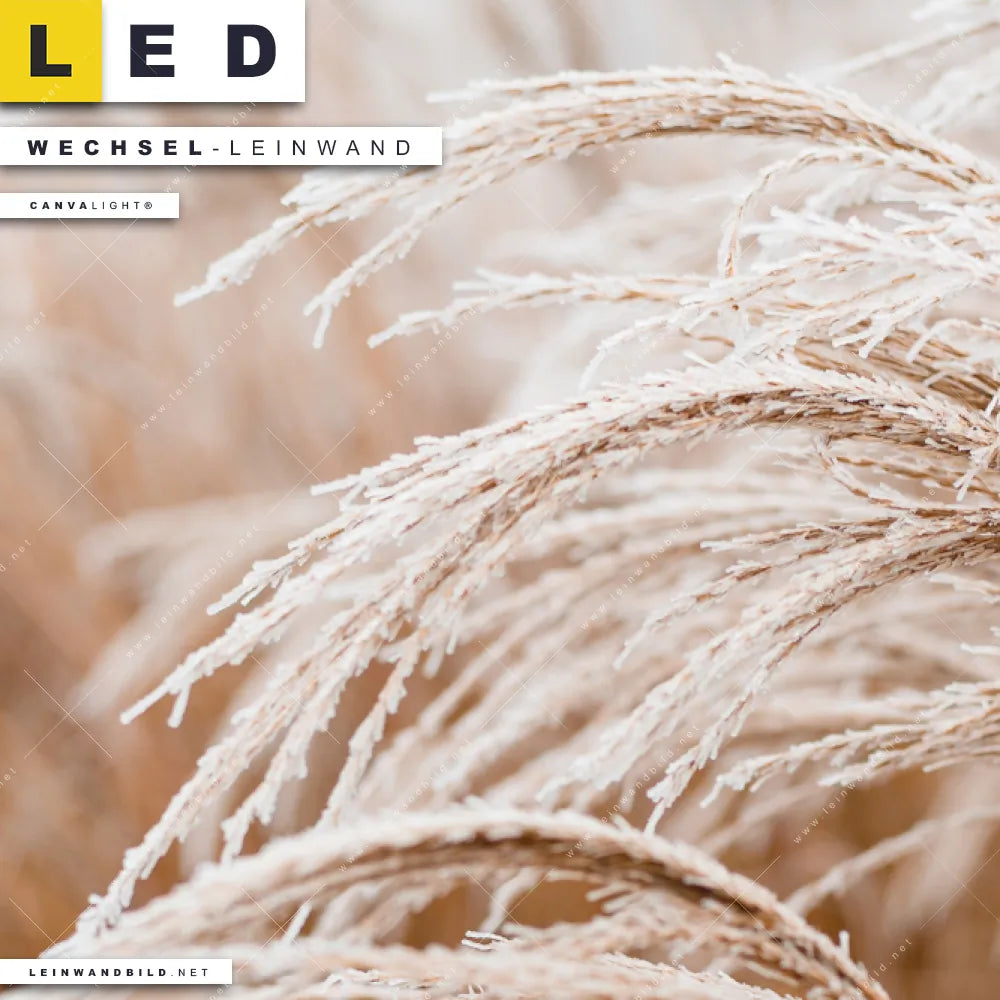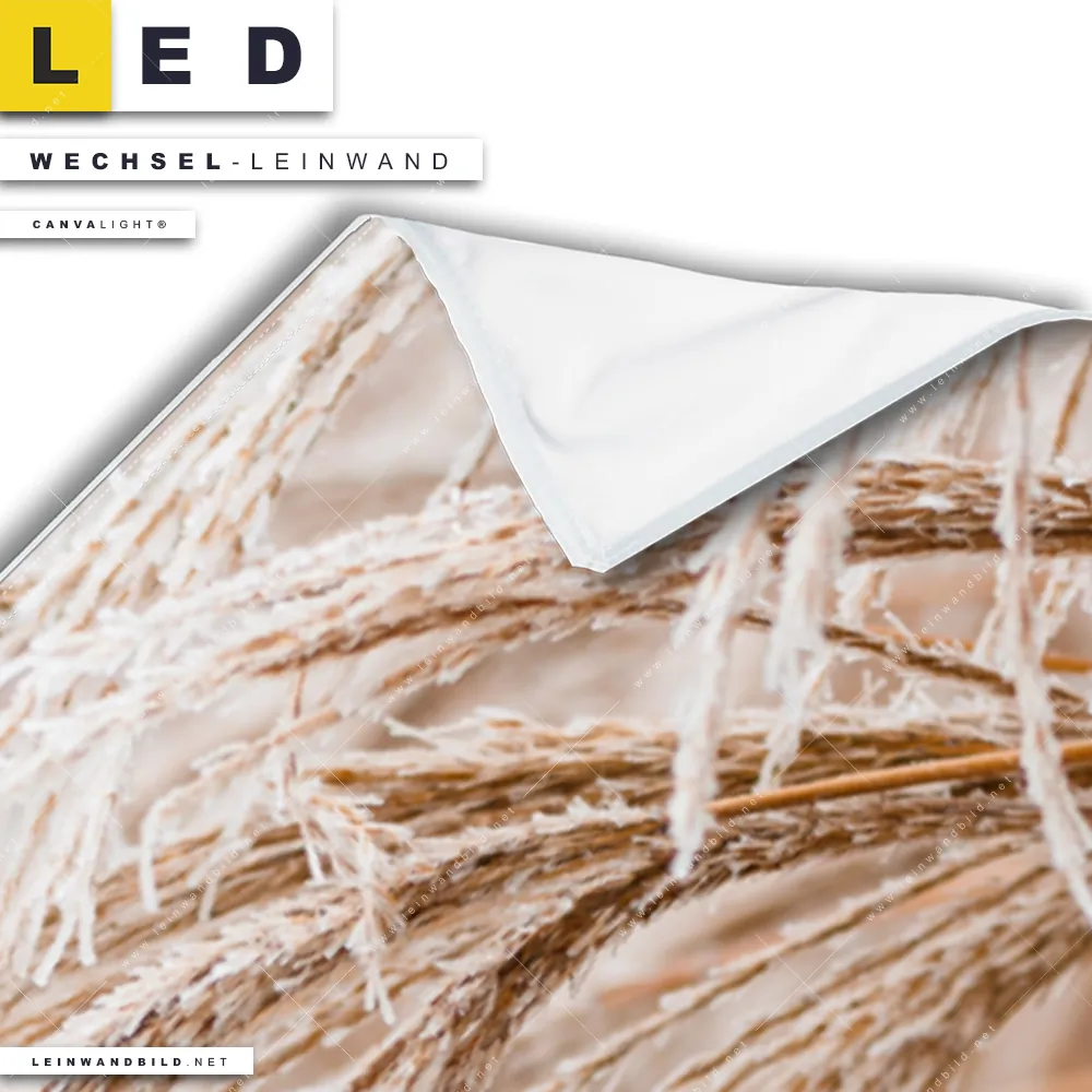 Du konfigurierst Deine individuelle LED Wechsel-Leinwand Canvalight® TEX | Pampasgras | Panorama und wir produzieren sie NEU für Dich. Unsere Blumen - Botanik Austausch-Fotoleinwände für Canvalight® LED Bilder sind KEINE Lagerware. Du bist Dir unsicher, welches Motiv oder Format das richtige für dein individuelles LED Wechselmotiv auf Leinwand ist, dann helfen wir dir gerne weiter und beraten dich!