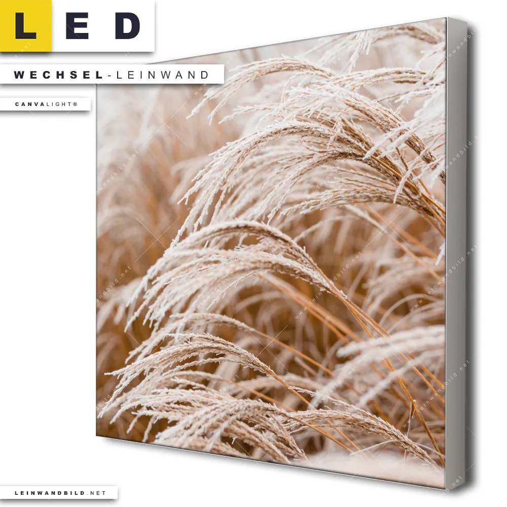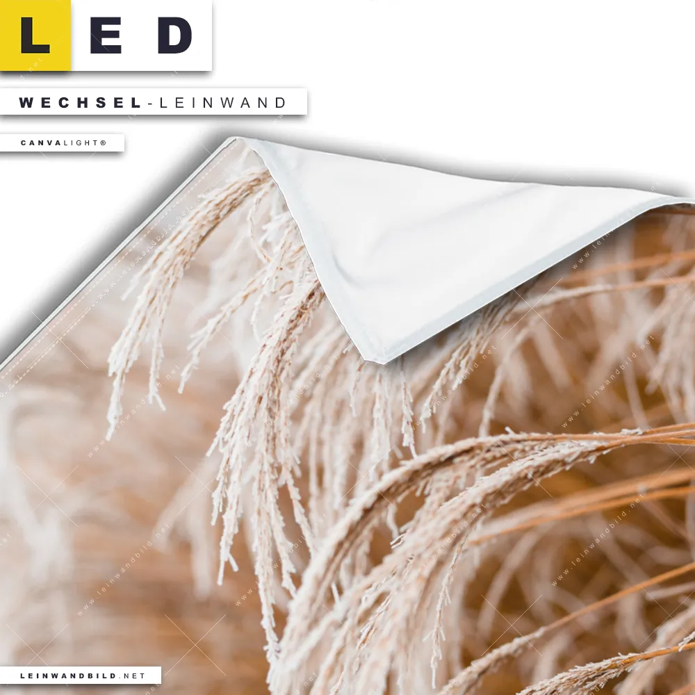 Du konfigurierst Deine individuelle LED Wechsel-Leinwand Canvalight® TEX | Pampasgras | Quadrat und wir produzieren sie NEU für Dich. Unsere Blumen - Botanik Austausch-Fotoleinwände für Canvalight® LED Bilder sind KEINE Lagerware. Du bist Dir unsicher, welches Motiv oder Format das richtige für dein individuelles LED Wechselmotiv auf Leinwand ist, dann helfen wir dir gerne weiter und beraten dich!