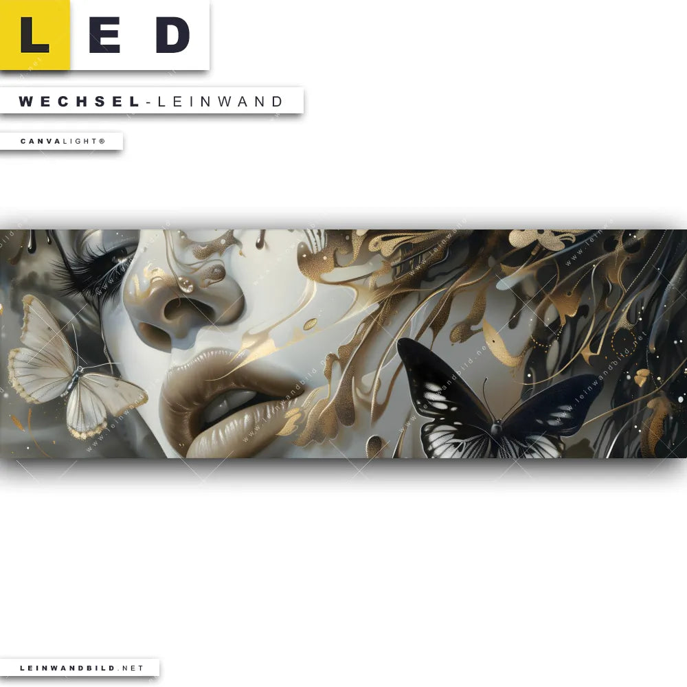 Du bist auf der Suche nach einer Porträts - Menschen Wechsel-Leinwand für Dein LED-Leinwandbild im Panorama-Format? Begriffe wie Porträt, Gesicht, Frau, Schmetterlinge, Frauenporträt, Fluid Art, Farbspritzer haben Dich auf der Suche nach Deiner Ersatz-Leinwand für dein extra breites LED Wandbild mit wechselbarer Leinwand inspiriert? Farben wie Gold, Grau , Schwarz, Beige dürfen auf Deinem neuen Wechselmotiv für Dein XXL Leinwand-LED-Bild nicht fehlen und Leinwände im Modern Art, Abstrakt Stil für Leuchtbilder passen perfekt zu Deinem Einrichtungsstil?