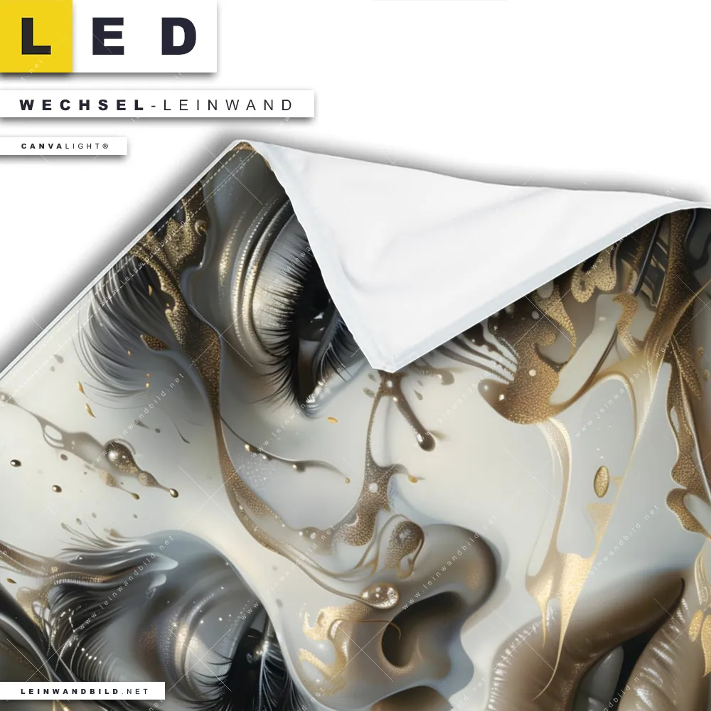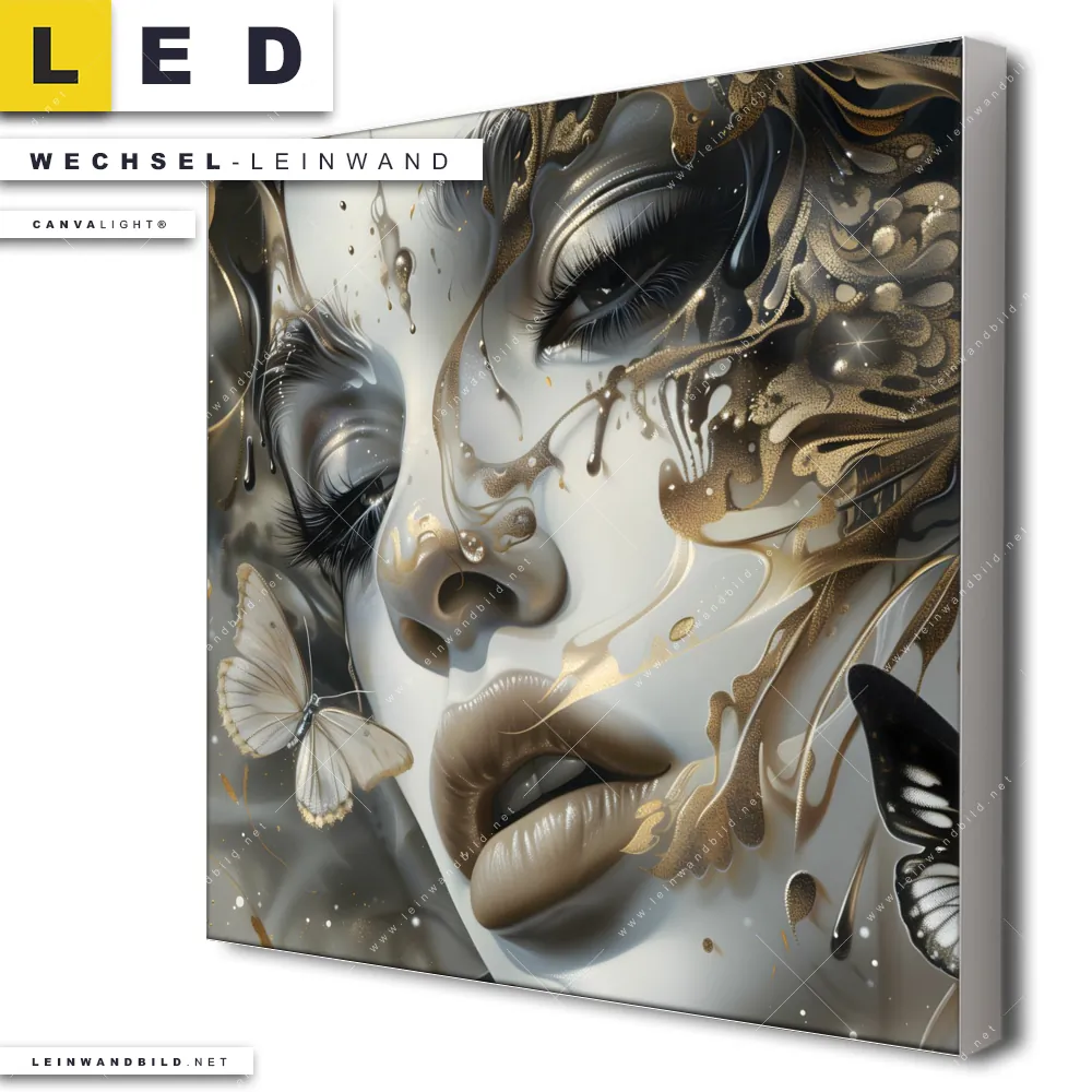 Du bist auf der Suche nach einer Porträts - Menschen Wechsel-Leinwand für Dein LED-Leinwandbild im Quadratischen Format? Begriffe wie Porträt, Gesicht, Frau, Schmetterlinge, Frauenporträt, Fluid Art, Farbspritzer haben Dich auf der Suche nach Deiner Ersatz-Leinwand für dein LED Wandbild mit wechselbarer Leinwand inspiriert? Farben wie Gold, Grau , Schwarz, Beige dürfen auf Deinem neuen Wechselmotiv für Dein XXL Leinwand-LED-Bild nicht fehlen und Leinwände im Modern Art, Abstrakt Stil für Leuchtbilder passen perfekt zu Deinem Einrichtungsstil?