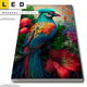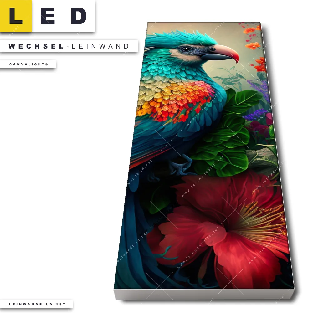 LED Wechsel-Leinwand Canvalight® TEX | Papagei und tropischer Hibiskus | Schmal