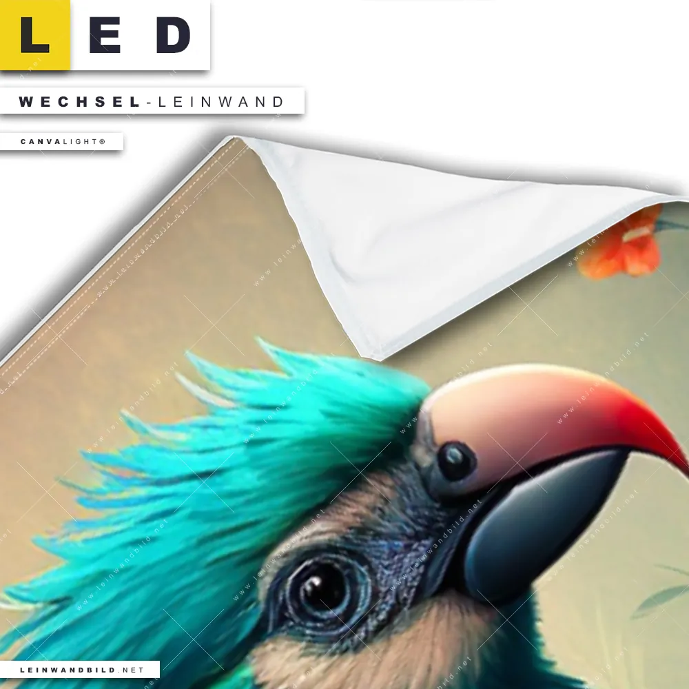 Du bist auf der Suche nach einer Tierwelt, Blumen - Botanik Wechsel-Leinwand für Dein LED-Leinwandbild im Schmalen Format? Begriffe wie Vogel, Papagei, Dschungel, Farbe, bunt, Blätter, Blüten, Blumen haben Dich auf der Suche nach Deiner Ersatz-Leinwand für dein LED Wandbild im Panorama-Hochformat mit wechselbarer Leinwand inspiriert? Farben wie Blau, Grün, Rot dürfen auf Deinem neuen Wechselmotiv für Dein XXL Leinwand-LED-Bild nicht fehlen und Leinwände im Floral, Modern Art Stil für Leuchtbilder passen perfekt zu Deinem Einrichtungsstil?