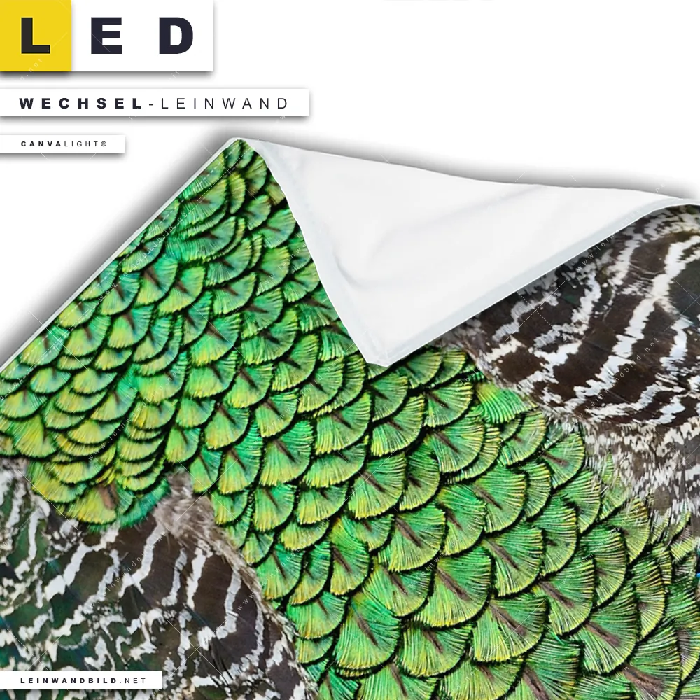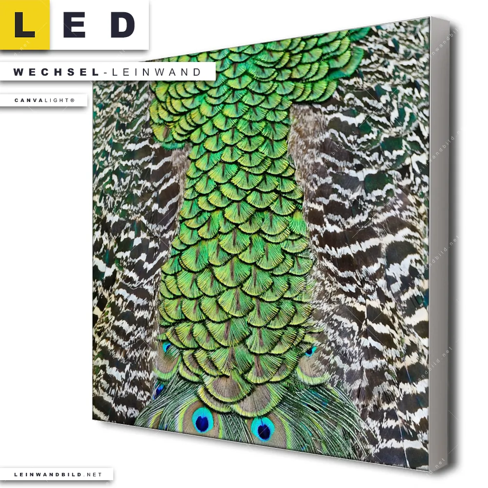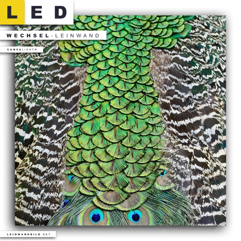Du bist auf der Suche nach einer Tierwelt, Muster - Texturen Wechsel-Leinwand für Dein LED-Leinwandbild im Quadratischen Format? Begriffe wie Vogel, Pfau, Dschungel, Federn, Pfaufedern haben Dich auf der Suche nach Deiner Ersatz-Leinwand für dein LED Wandbild mit wechselbarer Leinwand inspiriert? Farben wie Grün, Blau dürfen auf Deinem neuen Wechselmotiv für Dein XXL Leinwand-LED-Bild nicht fehlen und Leinwände im Natürlich - Realistisch Stil für Leuchtbilder passen perfekt zu Deinem Einrichtungsstil?