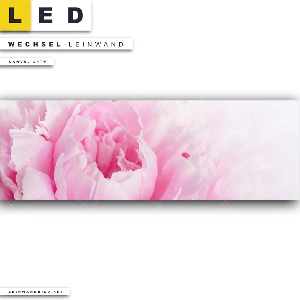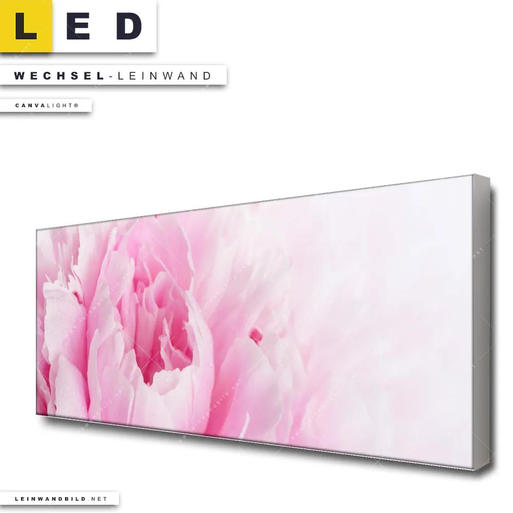 Du konfigurierst Deine individuelle LED Wechsel-Leinwand Canvalight® TEX | Pfingstrose | Panorama und wir produzieren sie NEU für Dich. Unsere Blumen - Botanik Austausch-Fotoleinwände für Canvalight® LED Bilder sind KEINE Lagerware. Du bist Dir unsicher, welches Motiv oder Format das richtige für dein individuelles LED Wechselmotiv auf Leinwand ist, dann helfen wir dir gerne weiter und beraten dich!
