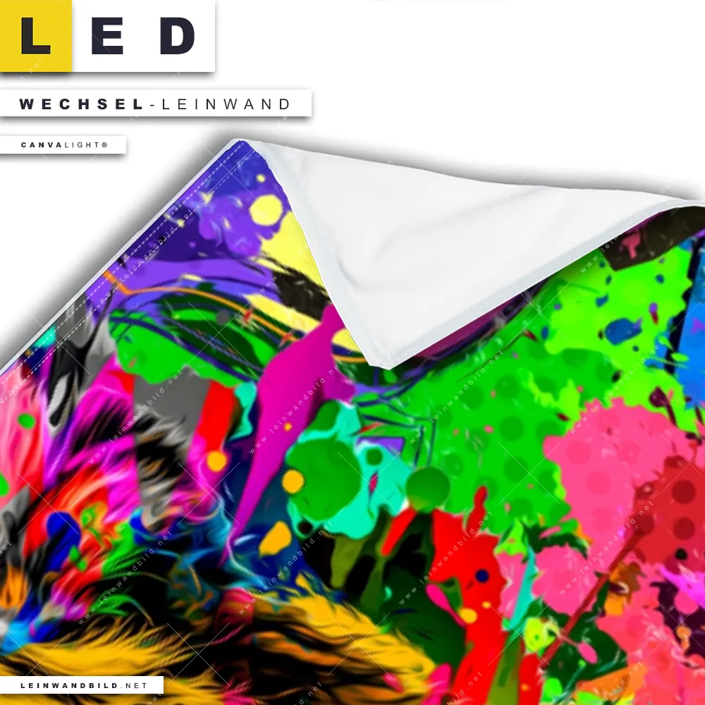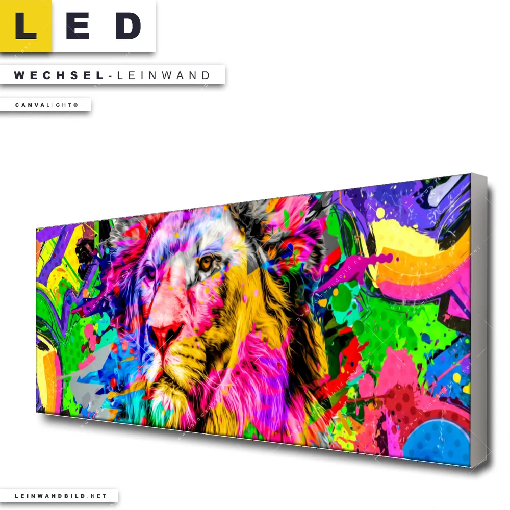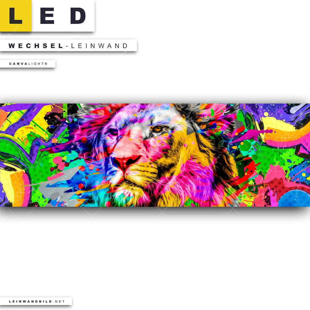 Du bist auf der Suche nach einer Tierwelt Wechsel-Leinwand für Dein LED-Leinwandbild im Panorama-Format? Begriffe wie Raubkatze, Löwe, Afrika, Dschungel, Lion, Farbexplosion, Farbspritzer, Farbe, Porträt haben Dich auf der Suche nach Deiner Ersatz-Leinwand für dein extra breites LED Wandbild mit wechselbarer Leinwand inspiriert? Farben wie Bunt dürfen auf Deinem neuen Wechselmotiv für Dein XXL Leinwand-LED-Bild nicht fehlen und Leinwände im Abstrakt, Modern Art, Pop Art Stil für Leuchtbilder passen perfekt zu Deinem Einrichtungsstil?