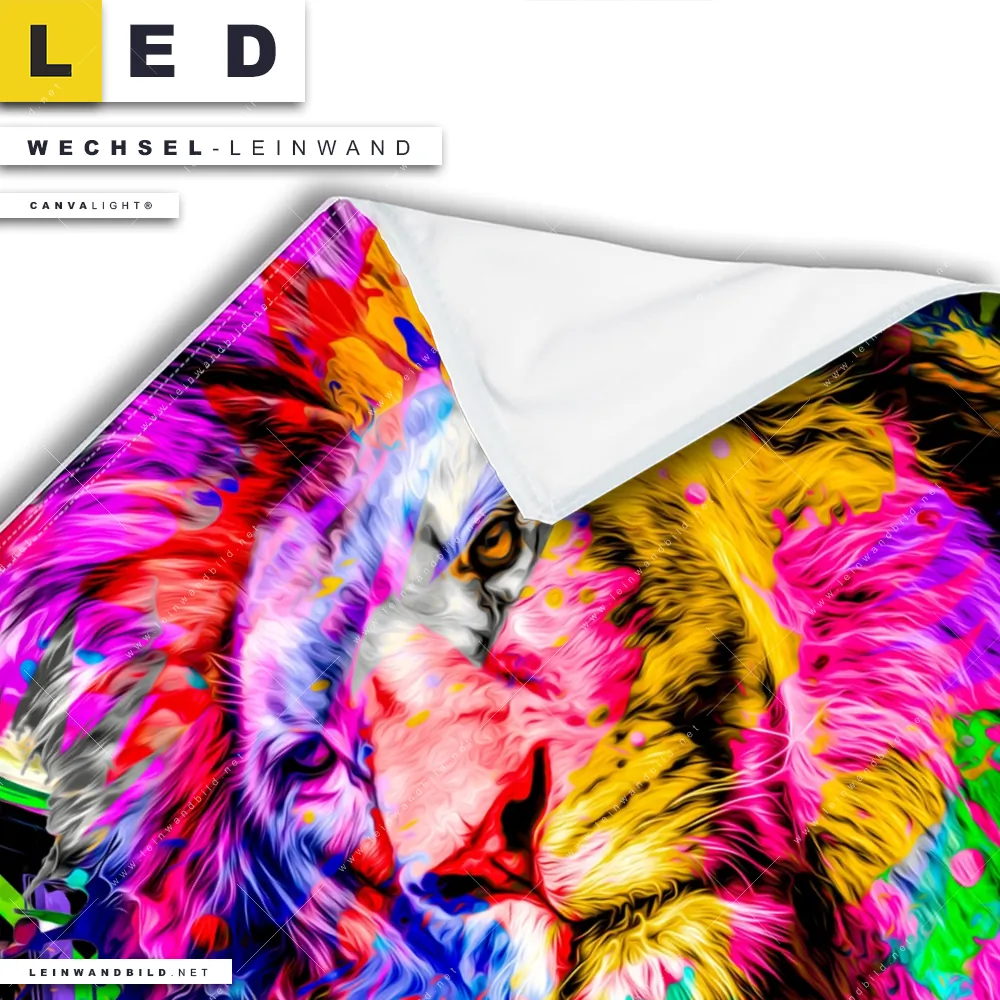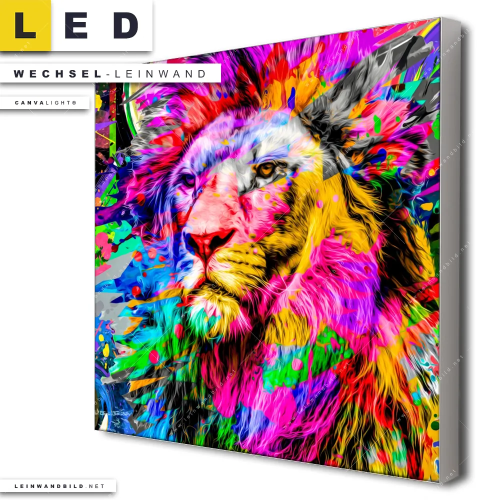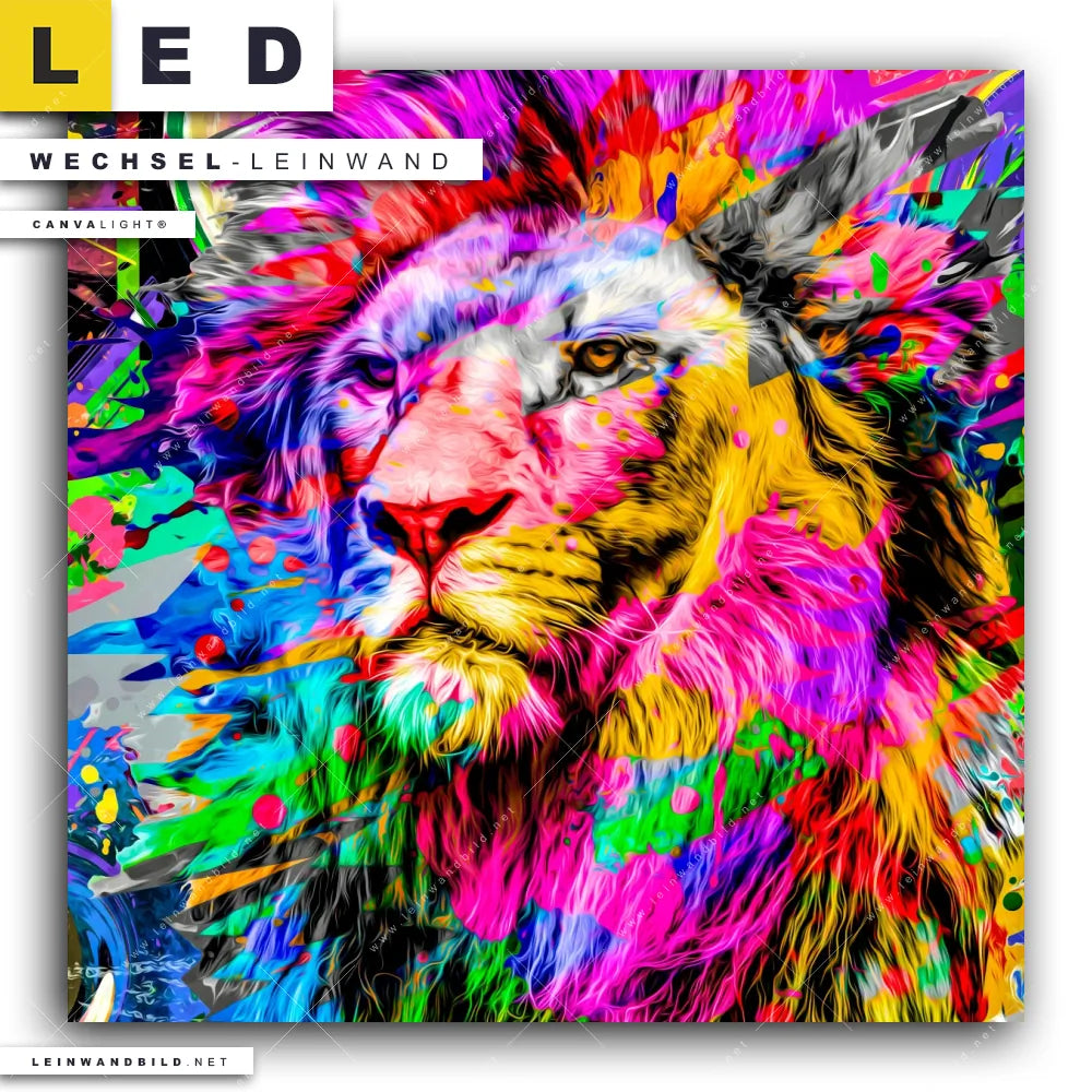 Du bist auf der Suche nach einer Tierwelt Wechsel-Leinwand für Dein LED-Leinwandbild im Quadratischen Format? Begriffe wie Raubkatze, Löwe, Afrika, Dschungel, Lion, Farbexplosion, Farbspritzer, Farbe, Porträt haben Dich auf der Suche nach Deiner Ersatz-Leinwand für dein LED Wandbild mit wechselbarer Leinwand inspiriert? Farben wie Bunt dürfen auf Deinem neuen Wechselmotiv für Dein XXL Leinwand-LED-Bild nicht fehlen und Leinwände im Abstrakt, Modern Art, Pop Art Stil für Leuchtbilder passen perfekt zu Deinem Einrichtungsstil?