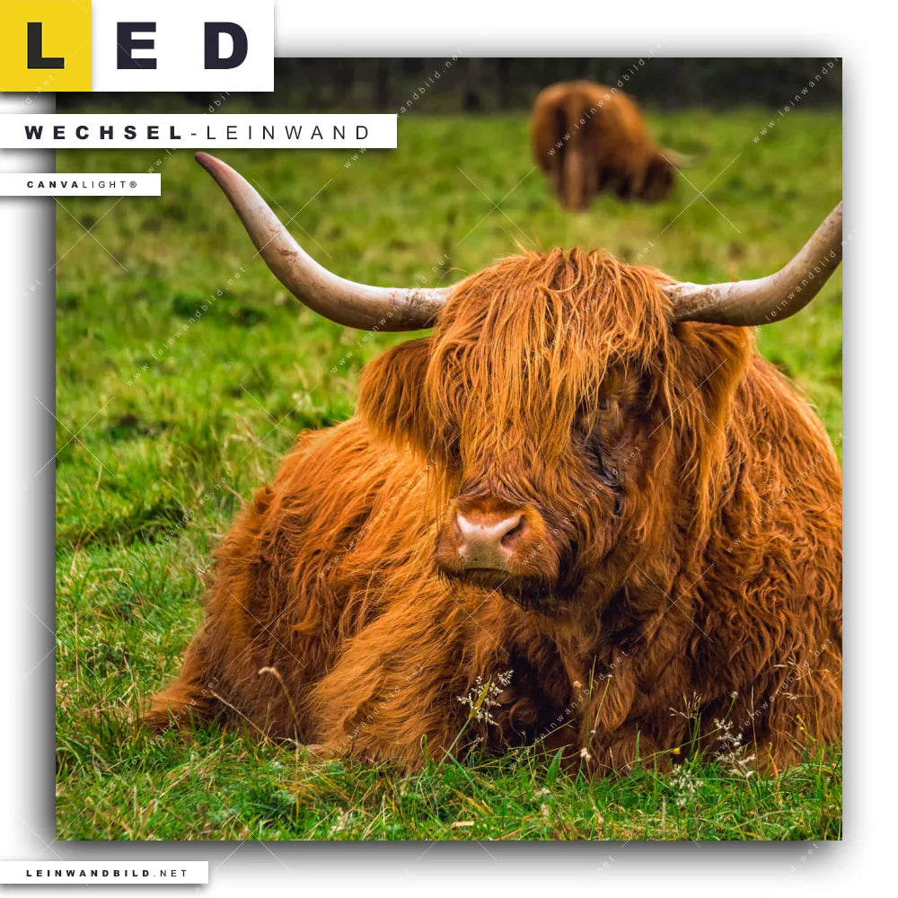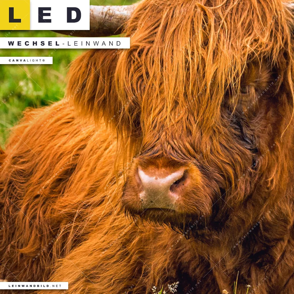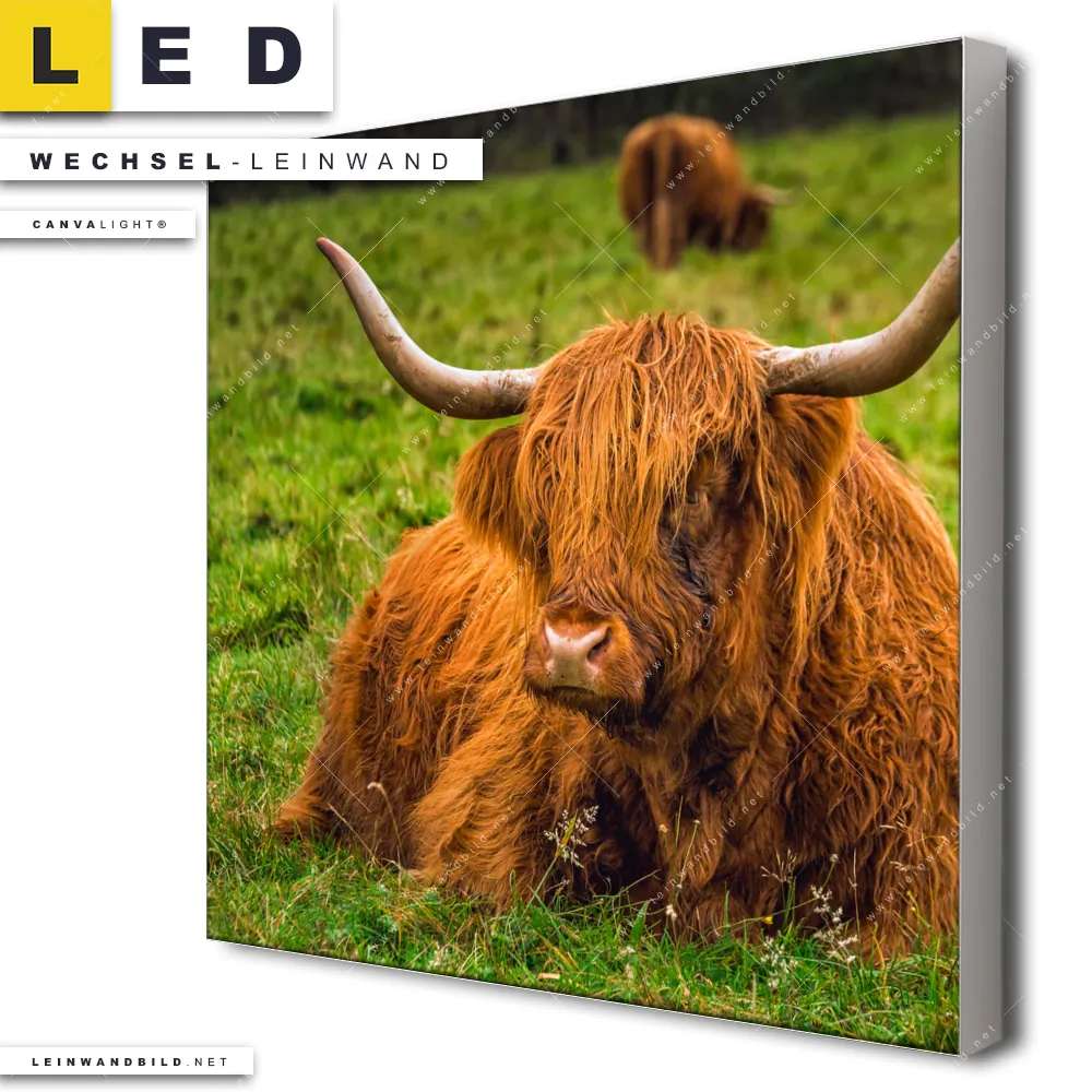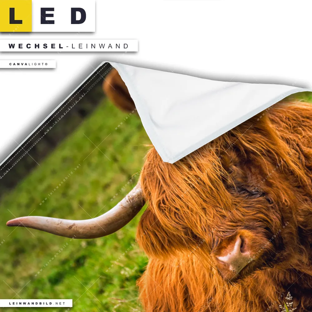 LED Wechsel-Leinwand Canvalight® TEX | Rind in den schottischen Highlands | Quadrat