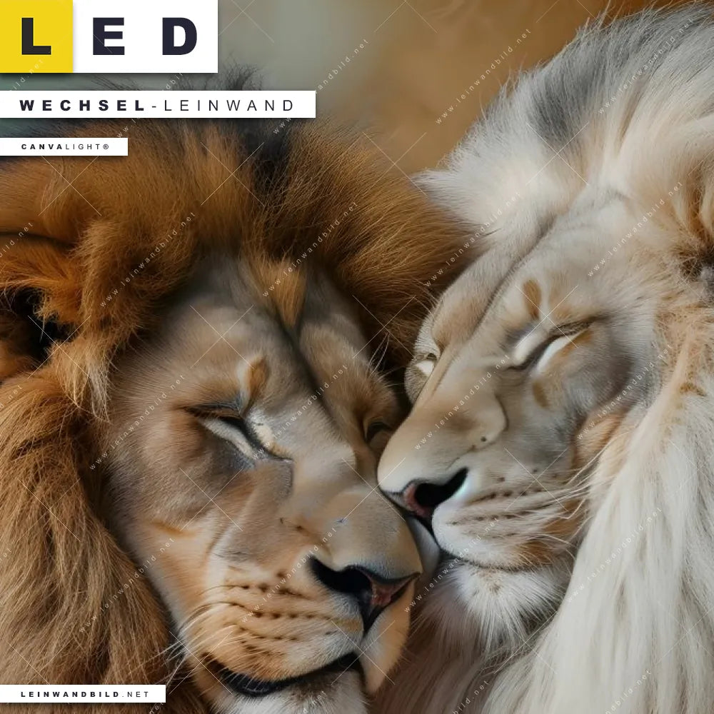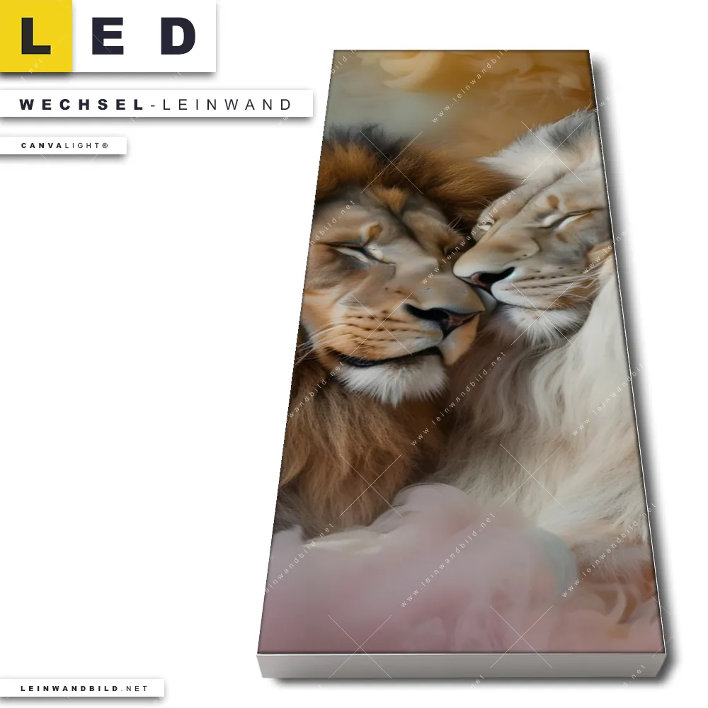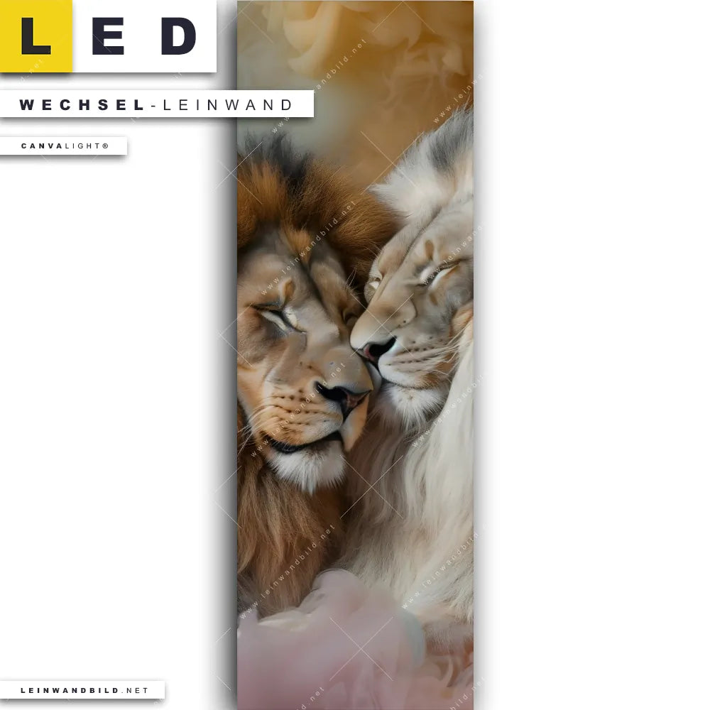 LED Wechsel-Leinwand Canvalight® TEX | Sanfte Löwenmomente in buntem Nebel | Schmal