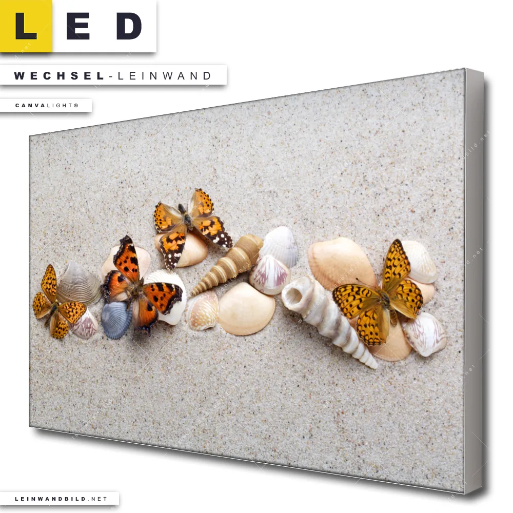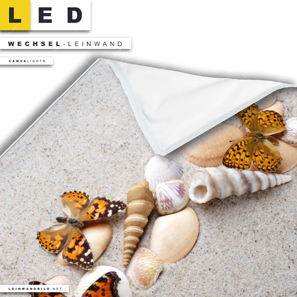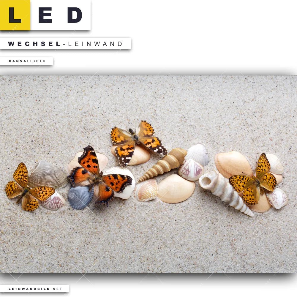 LED Wechsel-Leinwand Canvalight® TEX | Schmetterlinge & Muscheln im Sand | Querformat